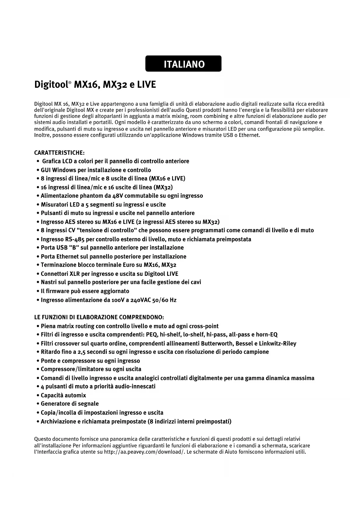 Scarica le istruzioni per il tuo Non categorizzato in formato PDF gratuitamente! Trova il tuo manuale Digitool MX32 - PEAVEY e riprendi in mano il tuo dispositivo elettronico. In questa pagina sono pubblicati tutti i documenti necessari per l'utilizzo del tuo dispositivo. Digitool MX32 del marchio PEAVEY.