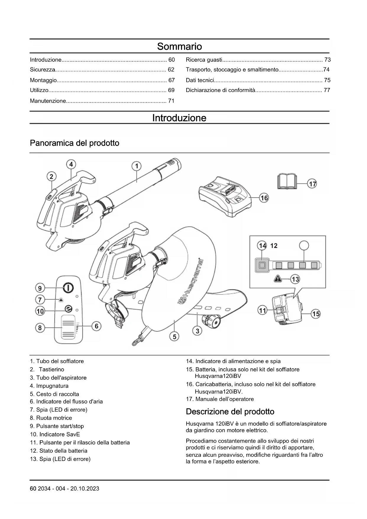 Descrizione del prodotto Husqvarna 120iBV è un modello di soffiatore/aspiratore da giardino con motore elettrico. Procediamo costantemente allo sviluppo dei nostri prodotti e ci riserviamo quindi il diritto di apportare, senza alcun preavviso, modifiche riguardanti fra l’altro la forma e l’aspetto esteriore. 60 2034 - 004 - 20.10.2023Uso previsto Modalità soffiatore: Il soffiatore è progettato per soffiare particelle di sporco o detriti d'erba da sentieri, vialetti, cortili e simili. È inoltre progettato per soffiare residui d'erba, paglia o foglie creando pile o per rimuovere particelle di sporcizia da angoli, giunti o spazi vuoti tra piastrelle o mattoni. Modalità aspiratore: L'aspiratore è progettato per aspirare materiali asciutti. Ciò include foglie, erba, ramoscelli e pezzi di carta. Simboli riportati sul prodotto AVVERTENZA: questo prodotto può essere pericoloso e causare lesioni gravi o mortali all'operatore o a terzi. Prestare attenzione e utilizzare il prodotto correttamente. Leggere attentamente il Manuale dell'operatore e accertarsi di aver compreso le istruzioni prima di utilizzare questo prodotto. Utilizzare protezioni per gli occhi omologate. Tensione nominale, V Corrente diretta. Emissioni di rumore nell'ambiente in conformità alle direttive e alle norme UE e UK e alla norma del Nuovo Galles del Sud in materia di protezione dell'ambiente "Protection of the Environment Operations (Noise Control) Regulation 2017". Il livello di potenza sonora garantito del prodotto è specificato in Dati tecnici alla pagina 75 nonché sull'etichetta. Scollegare la batteria prima di eseguire la manutenzione. Il prodotto o l'imballaggio del prodotto non è un rifiuto domestico. Riciclarlo in una stazione di riciclaggio per apparecchiature elettriche ed elettroniche. Il prodotto è conforme alle direttive CE vigenti. Il presente prodotto è conforme alle direttive del Regno Unito vigenti. Non esporre alla pioggia. Dopo aver spento il pro- dotto, attendere fino all'ar- resto delle lame del rotore. Utilizzare il prodotto in modalità aspiratore solo quando il tubo è completa- mente assemblato. Il conducente del soffiatore deve con- trollare che non vi siano persone od animali in un raggio di 15 metri. An- che più conducenti che lavorino con- temporaneamente nello stesso luogo devono mantenere tra loro una di- stanza di sicurezza non inferiore a 15 metri. Il soffiatore può urtare violente- mente oggetti che possono rimbalza- re, causando seri danni agli occhi se non vengono usati i dispositivi di sicu- rezza consigliati. aaaa-ssxxxxx La targhetta dati di funzionamento mostra il numero di serie. aaaa è l'an- no di produzione, ww è la settimana di produzione. Nota: I restanti simboli/decalcomanie applicati sull'accessorio riguardano particolari requisiti necessari per ottenere la certificazione in alcuni mercati. Simboli sulla batteria e/o sul caricabatterie Riciclare questo prodotto in una stazione di riciclaggio per apparecchiature elettriche ed elettroniche. (Solo per l'Euro- pa) 2034 - 004 - 20.10.2023 61Trasformatore a prova di guasto. Utilizzare e conservare il caricabatteria solo in ambienti interni. Doppio isolamento. Produttore Husqvarna AB Drottninggatan 2, SE-561 82 Huskvarna Danni al prodotto Non siamo responsabili dei danni al prodotto se:
