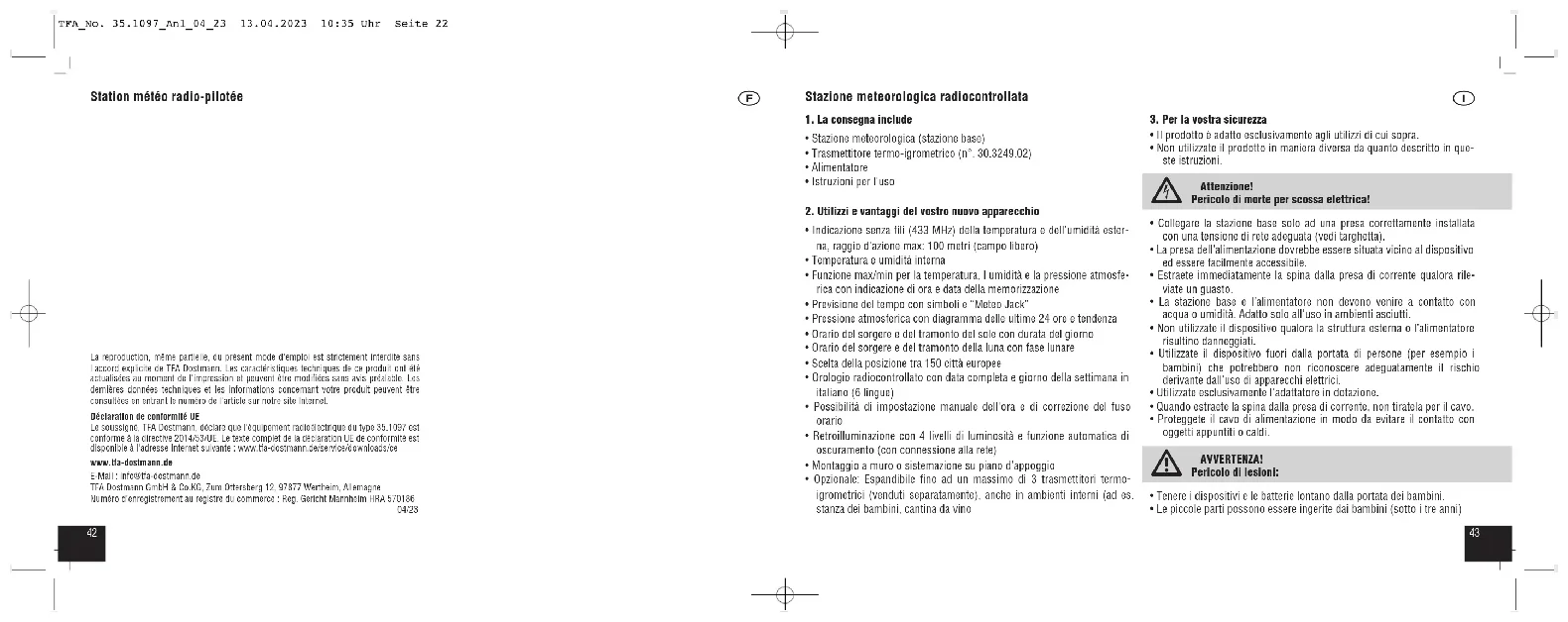 - Le piccole parti possono essere ingerite dai bambini (sotto i tre anni) TFA_No. 35.1097_Anl_04_23 13.04.2023 10:35 Uhr Seite 224544 Stazione meteorologica radiocontrollata