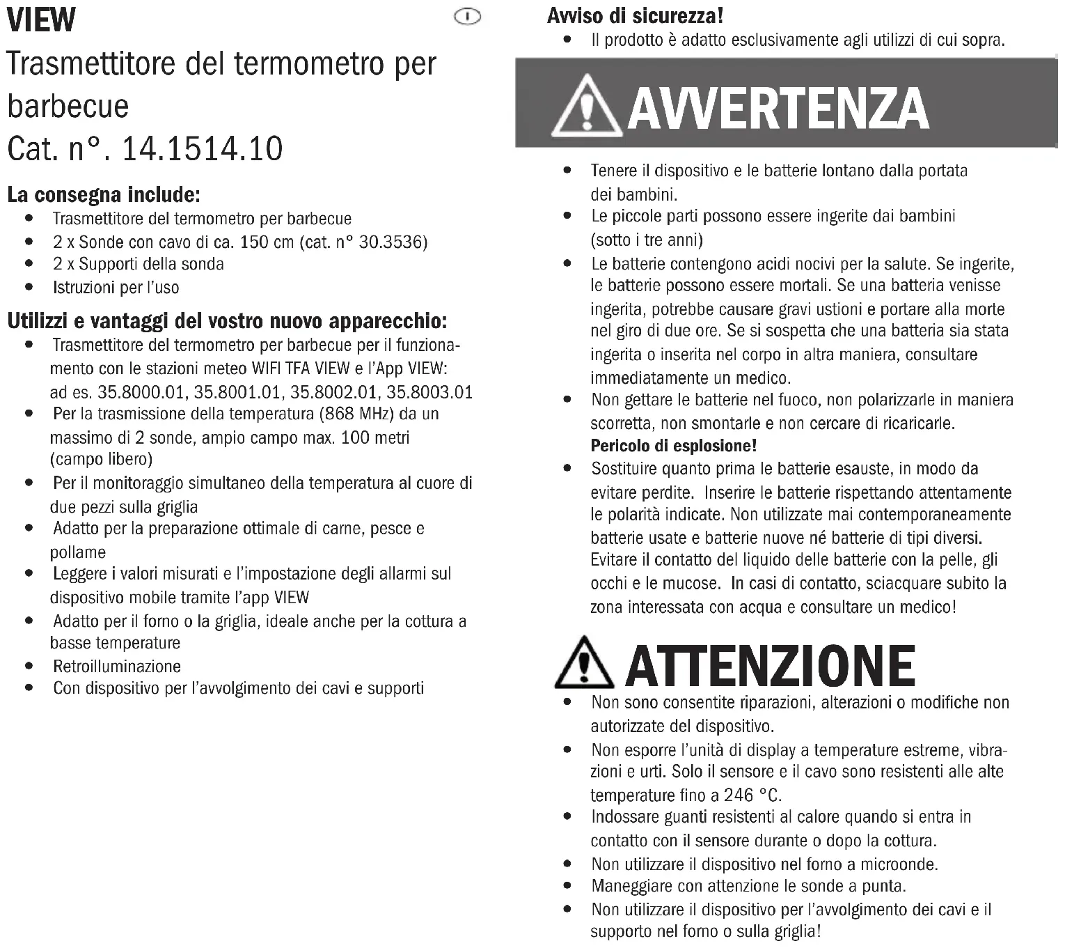 02/23VIEW Trasmettitore del termometro per barbecue Cat. n°. 14.1514.10 La consegna include: y Trasmettitore del termometro per barbecue y 2 x Sonde con cavo di ca. 150 cm (cat. n° 30.3536) y 2 x Supporti della sonda y Istruzioni per l’uso Utilizzi e vantaggi del vostro nuovo apparecchio: y Trasmettitore del termometro per barbecue per il funziona- mento con le stazioni meteo WIFI TFA VIEW e l’App VIEW: ad es. 35.8000.01, 35.8001.01, 35.8002.01, 35.8003.01 y Per la trasmissione della temperatura (868 MHz) da un massimo di 2 sonde, ampio campo max. 100 metri (campo libero) y Per il monitoraggio simultaneo della temperatura al cuore di due pezzi sulla griglia y Adatto per la preparazione ottimale di carne, pesce e pollame y Leggere i valori misurati e l’impostazione degli allarmi sul dispositivo mobile tramite l’app VIEW y Adatto per il forno o la griglia, ideale anche per la cottura a basse temperature y Retroilluminazione y Con dispositivo per l’avvolgimento dei cavi e supporti Avviso di sicurezza! y Il prodotto è adatto esclusivamente agli utilizzi di cui sopra. AVVERTENZA y Tenere il dispositivo e le batterie lontano dalla portata dei bambini. y Le piccole parti possono essere ingerite dai bambini (sotto i tre anni) y Le batterie contengono acidi nocivi per la salute. Se ingerite, le batterie possono essere mortali. Se una batteria venisse ingerita, potrebbe causare gravi ustioni e portare alla morte nel giro di due ore. Se si sospetta che una batteria sia stata ingerita o inserita nel corpo in altra maniera, consultare immediatamente un medico. y Non gettare le batterie nel fuoco, non polarizzarle in maniera scorretta, non smontarle e non cercare di ricaricarle. Pericolo di esplosione! y Sostituire quanto prima le batterie esauste, in modo da evitare perdite. Inserire le batterie rispettando attentamente le polarità indicate. Non utilizzate mai contemporaneamente batterie usate e batterie nuove né batterie di tipi diversi. Evitare il contatto del liquido delle batterie con la pelle, gli occhi e le mucose. In casi di contatto, sciacquare subito la zona interessata con acqua e consultare un medico! ATTENZIONE y Non sono consentite riparazioni, alterazioni o modiche non autorizzate del dispositivo. y Non esporre l’unità di display a temperature estreme, vibra- zioni e urti. Solo il sensore e il cavo sono resistenti alle alte temperature no a 246 °C. y Indossare guanti resistenti al calore quando si entra in contatto con il sensore durante o dopo la cottura. y Non utilizzare il dispositivo nel forno a microonde. y Maneggiare con attenzione le sonde a punta. y Non utilizzare il dispositivo per l’avvolgimento dei cavi e il supporto nel forno o sulla griglia!Componenti Trasmettitore per barbecue (Fig.1) Struttura esterna Fig.1-A Display Fig.1-B Tasto sensore ON/OFF Fig.1-C Apertura per il connettore con coperchio di protezione di gomma Fig.1-D Tasto SET Fig.1-E Tasto + Fig.1-F Coperchio del vano batterie con supporto (pieghevole) Fig.1-G Vano batteria Fig.1-H Sonda di inserimento Fig.1-J Connettore a spina Fig.1-K Cavo (ca. 150cm) Display Fig.1-A1 Icona di trasmissione Fig.1-A2 Ora AM/PM o visualizzazione della temperatura sonda B/A Fig.1-A3 Visualizzazione della temperatura sonda A/B Fig.1-A4 Simbolo della batteria Supporto della sonda (Fig.2) Struttura esterna Fig.2-A Supporto della sonda Fig.2-B Dispositivo per l’avvolgimento dei cavi Messa in funzione Inserire le batterie e impostare l’ora y Rimuovere il foglio protettivo dal display. y Aprire il vano batteria sulla parte posteriore, tirando il coper- chio verso il basso e inserire due batterie nuove tipo AAA da 1,5 V, rispettando le corrette polarità. y Richiudere il vano batteria. y Tutti i segmenti appaiono e la retroilluminazione si accende brevemente. y Sul display viene visualizzata l’ora. y Tenere premuto il tasto SET per entrare nella modalità di impostazione. y L’indicazione dell’ora lampeggia. Impostare con il tasto + le ore. Quando si imposta l’ora, tenere presente le indicazioni della mattina (AM) e del pomeriggio (PM). Confermare con il tasto SET. y L’indicazione dei minuti lampeggia. Impostare con il tasto + i minuti. Confermare con il tasto SET. y L’indicazione °C lampeggia. Premendo il tasto + è possibile scegliere fra la visualizzazione della temperatura in gradi °C (gradi Celsius) o °F (gradi Fahrenheit). Confermare con il tasto SET. y L’apparecchio è pronto per l’uso. Uso Collegare le sonde e misurare la temperatura interna y Per accendere e spegnere l’apparecchio, tenere premuto il tasto sensore ON/OFF. y Rimuovere il coperchio di protezione di gomma dall’apertura per il connettore (A). Inserire il connettore a la presa. y Inserire la sonda ad almeno 2,5 cm di profondità al centro della parte di carne più spessa, per il pollame tra il petto e le cosce; la punta non deve toccare né le ossa né la cartilagine e non deve sporgere dall’arrosto. Il sensore resterà nel forno durante tutto il procedimento di cottura. y Con il coperchio grill chiuso o nel forno portare semplicemen- te i cavi all’esterno. Attenzione a spigoli vivi e cerniere. y Se si vuole misurare la temperatura della camera di cottura, posizionare la sonda nel forno o sulla griglia. y Per ssare la sonda della temperatura alla griglia, consiglia- mo la clip per termometro per arrosti (cat. N° 30.3525.60). y Quando si utilizzano entrambe le sonde, inserire il secondo connettore nell’apertura opposta (B). y Dopo aver inserito una sonda, la visualizzazione della tempe- ratura richiede alcuni secondi. y Le visualizzazioni differiscono a seconda del numero di sonde collegate.y Se sono collegate due sonde, è possibile utiliz- zare il pulsante + per scegliere tra la visualizza- zione di entrambe le sonde e la visualizzazione dell’ora in combinazione con la temperatura attualmente più alta.