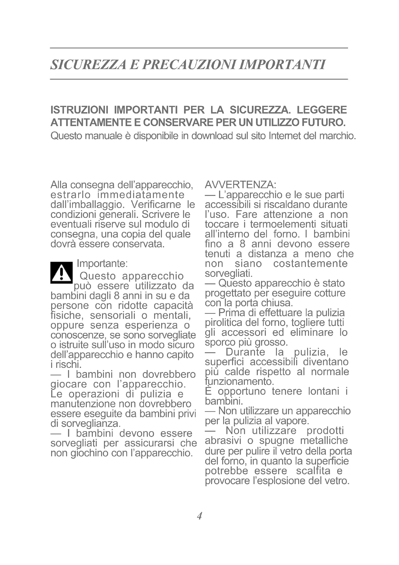 Alla consegna dell’apparecchio, estrarlo immediatamente dall’imballaggio. Verificarne le condizioni generali. Scrivere le eventuali riserve sul modulo di consegna, una copia del quale dovrà essere conservata. Importante: Questo apparecchio può essere utilizzato da bambini dagli 8 anni in su e da persone con ridotte capacità fisiche, sensoriali o mentali, oppure senza esperienza o conoscenze, se sono sorvegliate o istruite sull’uso in modo sicuro dell’apparecchio e hanno capito i rischi. — I bambini non dovrebbero giocare con l’apparecchio. Le operazioni di pulizia e manutenzione non dovrebbero essere eseguite da bambini privi di sorveglianza. — I bambini devono essere sorvegliati per assicurarsi che non giochino con l’apparecchio. AVVERTENZA: — L’apparecchio e le sue parti accessibili si riscaldano durante l’uso. Fare attenzione a non toccare i termoelementi situati all’interno del forno. I bambini fino a 8 anni devono essere tenuti a distanza a meno che non siano costantemente sorvegliati. — Questo apparecchio è stato progettato per eseguire cotture con la porta chiusa. — Prima di effettuare la pulizia pirolitica del forno, togliere tutti gli accessori ed eliminare lo sporco più grosso. — Durante la pulizia, le superfici accessibili diventano più calde rispetto al normale funzionamento. È opportuno tenere lontani i bambini. — Non utilizzare un apparecchio per la pulizia al vapore. — Non utilizzare prodotti abrasivi o spugne metalliche dure per pulire il vetro della porta del forno, in quanto la superficie potrebbe essere scalfita e provocare l’esplosione del vetro.