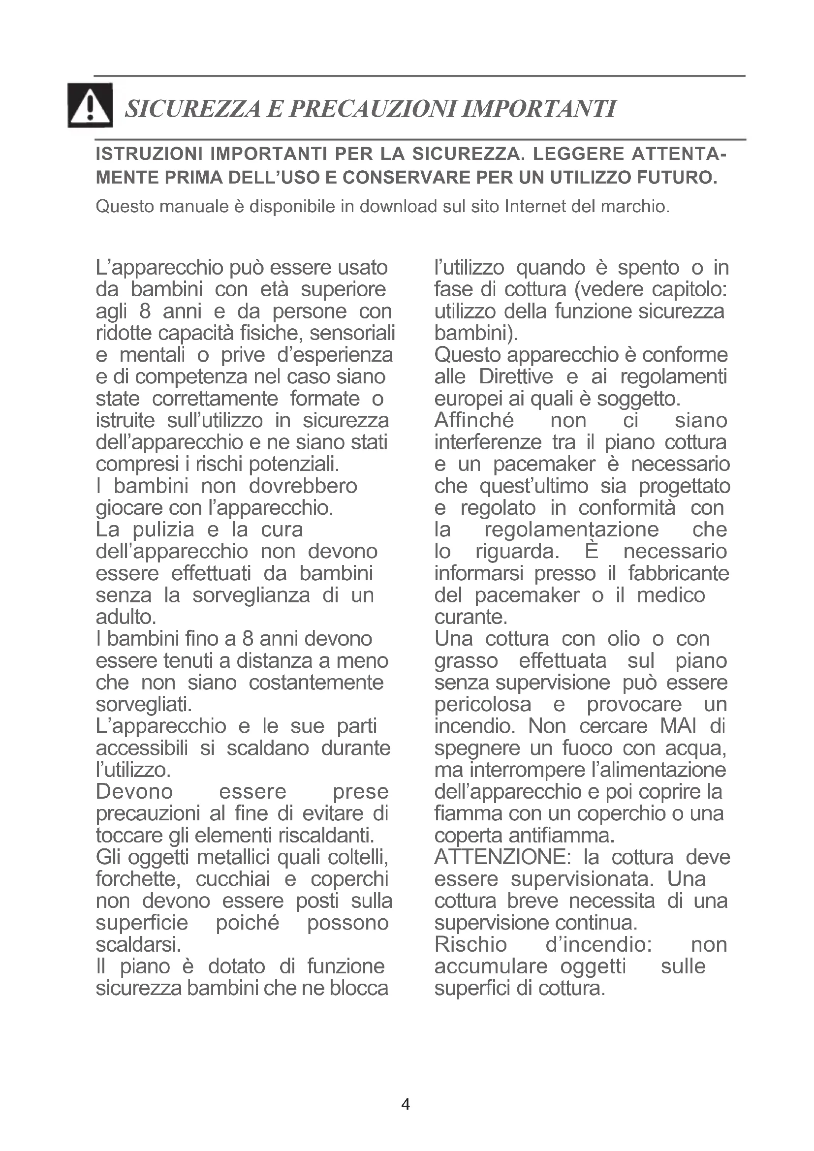 L’apparecchio può essere usato da bambini con età superiore agli 8 anni e da persone con ridotte capacità siche, sensoriali e mentali o prive d’esperienza e di competenza nel caso siano state correttamente formate o istruite sull’utilizzo in sicurezza dell’apparecchio e ne siano stati compresi i rischi potenziali. I bambini non dovrebbero giocare con l’apparecchio. La pulizia e la cura dell’apparecchio non devono essere eettuati da bambini senza la sorveglianza di un adulto. I bambini no a 8 anni devono essere tenuti a distanza a meno che non siano costantemente sorvegliati. L’apparecchio e le sue parti accessibili si scaldano durante l’utilizzo. Devono essere prese precauzioni al ne di evitare di toccare gli elementi riscaldanti. Gli oggetti metallici quali coltelli, forchette, cucchiai e coperchi non devono essere posti sulla superficie poiché possono scaldarsi. Il piano è dotato di funzione sicurezza bambini che ne blocca l’utilizzo quando è spento o in fase di cottura (vedere capitolo: utilizzo della funzione sicurezza bambini). Questo apparecchio è conforme alle Direttive e ai regolamenti europei ai quali è soggetto. Affinché non ci siano interferenze tra il piano cottura e un pacemaker è necessario che quest’ultimo sia progettato e regolato in conformità con la regolamentazione che lo riguarda. È necessario informarsi presso il fabbricante del pacemaker o il medico curante. Una cottura con olio o con grasso eettuata sul piano senza supervisione può essere pericolosa e provocare un incendio. Non cercare MAI di spegnere un fuoco con acqua, ma interrompere l’alimentazione dell’apparecchio e poi coprire la amma con un coperchio o una coperta antiamma. ATTENZIONE: la cottura deve essere supervisionata. Una cottura breve necessita di una supervisione continua. Rischio d’incendio: non accumulare oggetti sulle superci di cottura.5