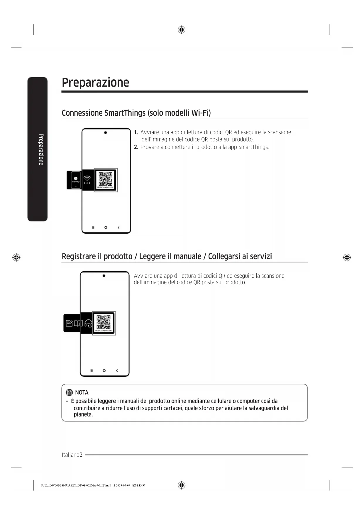 Registrare il prodotto / Leggere il manuale / Collegarsi ai servizi Avviare una app di lettura di codici QR ed eseguire la scansione dell’immagine del codice QR posta sul prodotto. NOTA