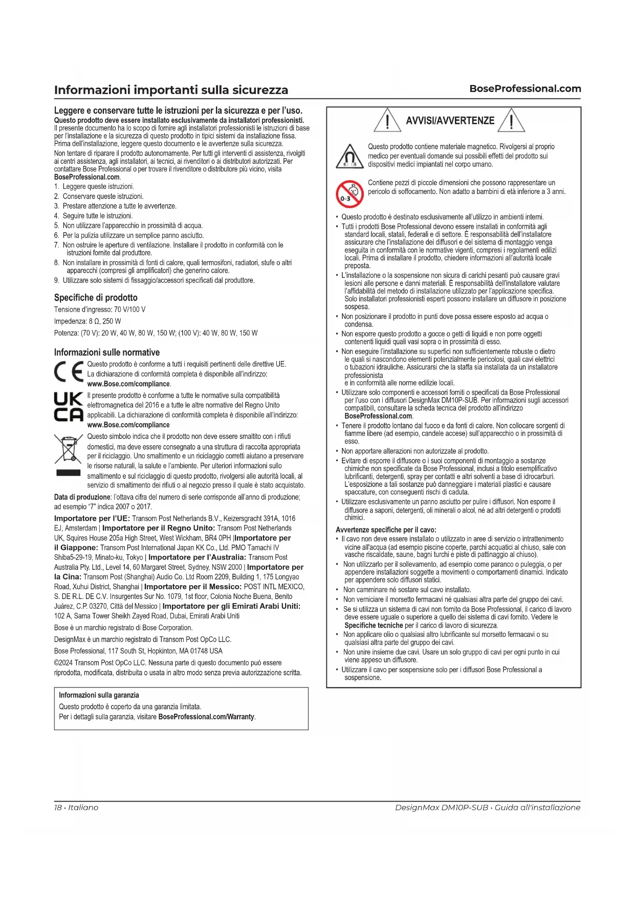Informazioni sulle normative Questo prodotto è conforme a tutti i requisiti pertinenti delle direttive UE. La dichiarazione di conformità completa è disponibile all’indirizzo: www.Bose.com/compliance. Il presente prodotto è conforme a tutte le normative sulla compatibilità elettromagnetica del 2016 e a tutte le altre normative del Regno Unito applicabili. La dichiarazione di conformità completa è disponibile all’indirizzo: www.Bose.com/compliance Questo simbolo indica che il prodotto non deve essere smaltito con i riuti domestici, ma deve essere consegnato a una struttura di raccolta appropriata per il riciclaggio. Uno smaltimento e un riciclaggio corretti aiutano a preservare le risorse naturali, la salute e l’ambiente. Per ulteriori informazioni sullo smaltimento e sul riciclaggio di questo prodotto, rivolgersi alle autorità locali, al servizio di smaltimento dei riuti o al negozio presso il quale è stato acquistato. Data di produzione: l’ottava cifra del numero di serie corrisponde all’anno di produzione; ad esempio “7” indica 2007 o 2017. Importatore per l’UE: Transom Post Netherlands B.V., Keizersgracht 391A, 1016 EJ, Amsterdam | Importatore per il Regno Unito: Transom Post Netherlands UK, Squires House 205a High Street, West Wickham, BR4 0PH |Importatore per il Giappone: Transom Post International Japan KK Co., Ltd. PMO Tamachi IV Shiba5-29-19, Minato-ku, Tokyo | Importatore per l’Australia: Transom Post Australia Pty. Ltd., Level 14, 60 Margaret Street, Sydney, NSW 2000 | Importatore per la Cina: Transom Post (Shanghai) Audio Co. Ltd Room 2209, Building 1, 175 Longyao Road, Xuhui District, Shanghai | Importatore per il Messico: POST INTL MEXICO, S. DE R.L. DE C.V. Insurgentes Sur No. 1079, 1st oor, Colonia Noche Buena, Benito Juárez, C.P. 03270, Città del Messico | Importatore per gli Emirati Arabi Uniti: 102 A, Sama Tower Sheikh Zayed Road, Dubai, Emirati Arabi Uniti Bose è un marchio registrato di Bose Corporation. DesignMax è un marchio registrato di Transom Post OpCo LLC. Bose Professional, 117 South St, Hopkinton, MA 01748 USA ©2024 Transom Post OpCo LLC. Nessuna parte di questo documento può essere riprodotta, modicata, distribuita o usata in altro modo senza previa autorizzazione scritta. Informazioni sulla garanzia Questo prodotto è coperto da una garanzia limitata. Per i dettagli sulla garanzia, visitare BoseProfessional.com/Warranty. Speciche di prodotto Tensione d’ingresso: 70 V/100 V Impedenza: 8 Ω, 250 W Potenza: (70 V): 20 W, 40 W, 80 W, 150 W; (100 V): 40 W, 80 W, 150 W AVVISI/AVVERTENZE Questo prodotto contiene materiale magnetico. Rivolgersi al proprio medico per eventuali domande sui possibili effetti del prodotto sui dispositivi medici impiantati nel corpo umano. Contiene pezzi di piccole dimensioni che possono rappresentare un pericolo di soffocamento. Non adatto a bambini di età inferiore a 3 anni.