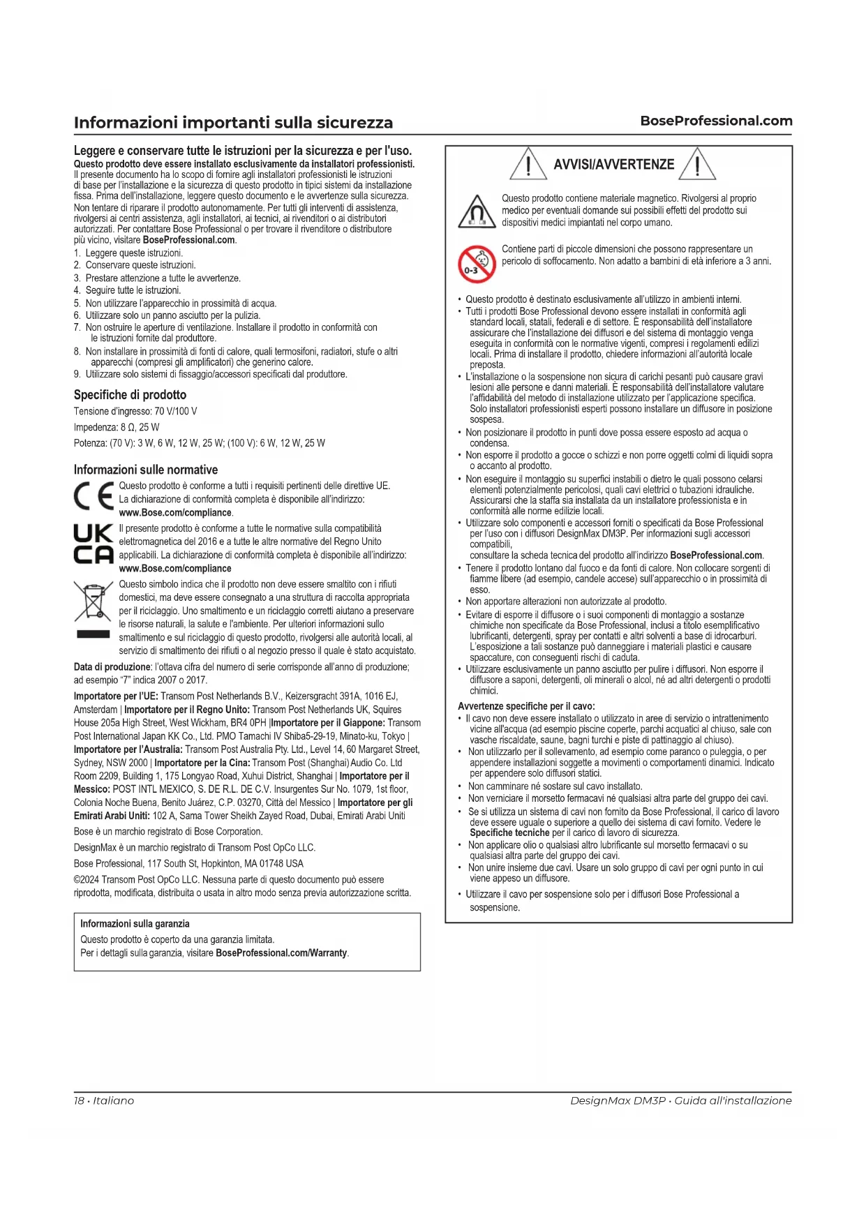 Informazioni sulle normative Questo prodotto è conforme a tutti i requisiti pertinenti delle direttive UE. La dichiarazione di conformità completa è disponibile all’indirizzo: www.Bose.com/compliance. Il presente prodotto è conforme a tutte le normative sulla compatibilità elettromagnetica del 2016 e a tutte le altre normative del Regno Unito applicabili. La dichiarazione di conformità completa è disponibile all’indirizzo: www.Bose.com/compliance Questo simbolo indica che il prodotto non deve essere smaltito con i riuti domestici, ma deve essere consegnato a una struttura di raccolta appropriata per il riciclaggio. Uno smaltimento e un riciclaggio corretti aiutano a preservare le risorse naturali, la salute e l'ambiente. Per ulteriori informazioni sullo smaltimento e sul riciclaggio di questo prodotto, rivolgersi alle autorità locali, al servizio di smaltimento dei riuti o al negozio presso il quale è stato acquistato. Data di produzione: l’ottava cifra del numero di serie corrisponde all’anno di produzione; ad esempio “7” indica 2007 o 2017. Importatore per l’UE: Transom Post Netherlands B.V., Keizersgracht 391A, 1016 EJ, Amsterdam | Importatore per il Regno Unito: Transom Post Netherlands UK, Squires House 205a High Street, West Wickham, BR4 0PH |Importatore per il Giappone: Transom Post International Japan KK Co., Ltd. PMO Tamachi IV Shiba5-29-19, Minato-ku, Tokyo | Importatore per l’Australia: Transom Post Australia Pty. Ltd., Level 14, 60 Margaret Street, Sydney, NSW 2000 | Importatore per la Cina: Transom Post (Shanghai) Audio Co. Ltd Room 2209, Building 1, 175 Longyao Road, Xuhui District, Shanghai | Importatore per il Messico: POST INTL MEXICO, S. DE R.L. DE C.V. Insurgentes Sur No. 1079, 1st oor, Colonia Noche Buena, Benito Juárez, C.P. 03270, Città del Messico | Importatore per gli Emirati Arabi Uniti: 102 A, Sama Tower Sheikh Zayed Road, Dubai, Emirati Arabi Uniti Bose è un marchio registrato di Bose Corporation. DesignMax è un marchio registrato di Transom Post OpCo LLC. Bose Professional, 117 South St, Hopkinton, MA 01748 USA ©2024 Transom Post OpCo LLC. Nessuna parte di questo documento può essere riprodotta, modicata, distribuita o usata in altro modo senza previa autorizzazione scritta. Informazioni sulla garanzia Questo prodotto è coperto da una garanzia limitata. Per i dettagli sulla garanzia, visitare BoseProfessional.com/Warranty. Speciche di prodotto Tensione d’ingresso: 70 V/100 V Impedenza: 8 Ω, 25 W Potenza: (70 V): 3 W, 6 W, 12 W, 25 W; (100 V): 6 W, 12 W, 25 W AVVISI/AVVERTENZE Questo prodotto contiene materiale magnetico. Rivolgersi al proprio medico per eventuali domande sui possibili effetti del prodotto sui dispositivi medici impiantati nel corpo umano. Contiene parti di piccole dimensioni che possono rappresentare un pericolo di soffocamento. Non adatto a bambini di età inferiore a 3 anni.
