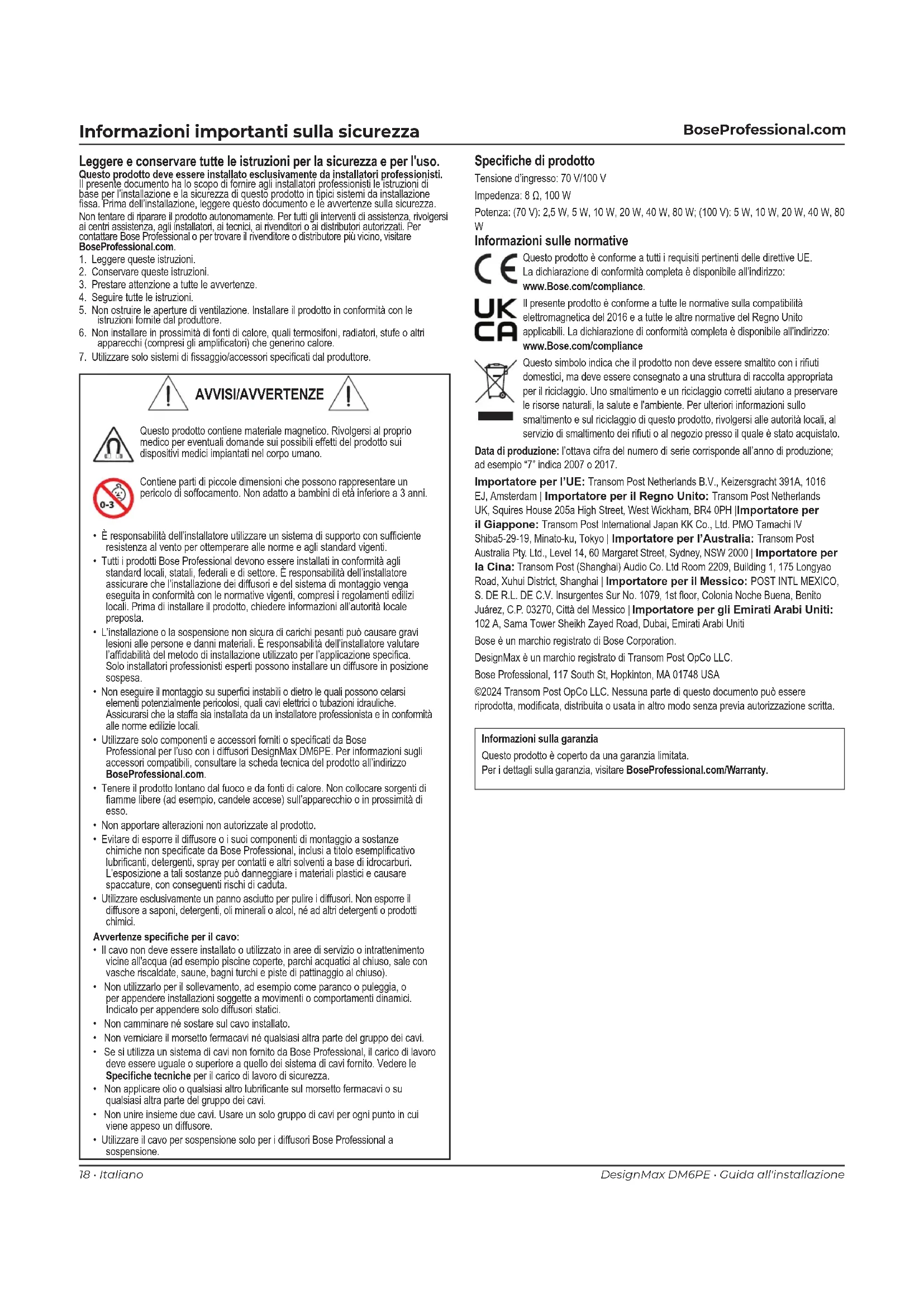 Informazioni sulle normative Questo prodotto è conforme a tutti i requisiti pertinenti delle direttive UE. La dichiarazione di conformità completa è disponibile all’indirizzo: www.Bose.com/compliance. Il presente prodotto è conforme a tutte le normative sulla compatibilità elettromagnetica del 2016 e a tutte le altre normative del Regno Unito applicabili. La dichiarazione di conformità completa è disponibile all’indirizzo: www.Bose.com/compliance Questo simbolo indica che il prodotto non deve essere smaltito con i riuti domestici, ma deve essere consegnato a una struttura di raccolta appropriata per il riciclaggio. Uno smaltimento e un riciclaggio corretti aiutano a preservare le risorse naturali, la salute e l'ambiente. Per ulteriori informazioni sullo smaltimento e sul riciclaggio di questo prodotto, rivolgersi alle autorità locali, al servizio di smaltimento dei riuti o al negozio presso il quale è stato acquistato. Data di produzione: l’ottava cifra del numero di serie corrisponde all’anno di produzione; ad esempio “7” indica 2007 o 2017. Importatore per l’UE: Transom Post Netherlands B.V., Keizersgracht 391A, 1016 EJ, Amsterdam | Importatore per il Regno Unito: Transom Post Netherlands UK, Squires House 205a High Street, West Wickham, BR4 0PH |Importatore per il Giappone: Transom Post International Japan KK Co., Ltd. PMO Tamachi IV Shiba5-29-19, Minato-ku, Tokyo | Importatore per l’Australia: Transom Post Australia Pty. Ltd., Level 14, 60 Margaret Street, Sydney, NSW 2000 | Importatore per la Cina: Transom Post (Shanghai) Audio Co. Ltd Room 2209, Building 1, 175 Longyao Road, Xuhui District, Shanghai | Importatore per il Messico: POST INTL MEXICO, S. DE R.L. DE C.V. Insurgentes Sur No. 1079, 1st oor, Colonia Noche Buena, Benito Juárez, C.P. 03270, Città del Messico | Importatore per gli Emirati Arabi Uniti: 102 A, Sama Tower Sheikh Zayed Road, Dubai, Emirati Arabi Uniti Bose è un marchio registrato di Bose Corporation. DesignMax è un marchio registrato di Transom Post OpCo LLC. Bose Professional, 117 South St, Hopkinton, MA 01748 USA ©2024 Transom Post OpCo LLC. Nessuna parte di questo documento può essere riprodotta, modicata, distribuita o usata in altro modo senza previa autorizzazione scritta. Informazioni sulla garanzia Questo prodotto è coperto da una garanzia limitata. Per i dettagli sulla garanzia, visitare BoseProfessional.com/Warranty. Speciche di prodotto Tensione d’ingresso: 70 V/100 V Impedenza: 8 Ω, 100 W Potenza: (70 V): 2,5 W, 5 W, 10 W, 20 W, 40 W, 80 W; (100 V): 5 W, 10 W, 20 W, 40 W, 80