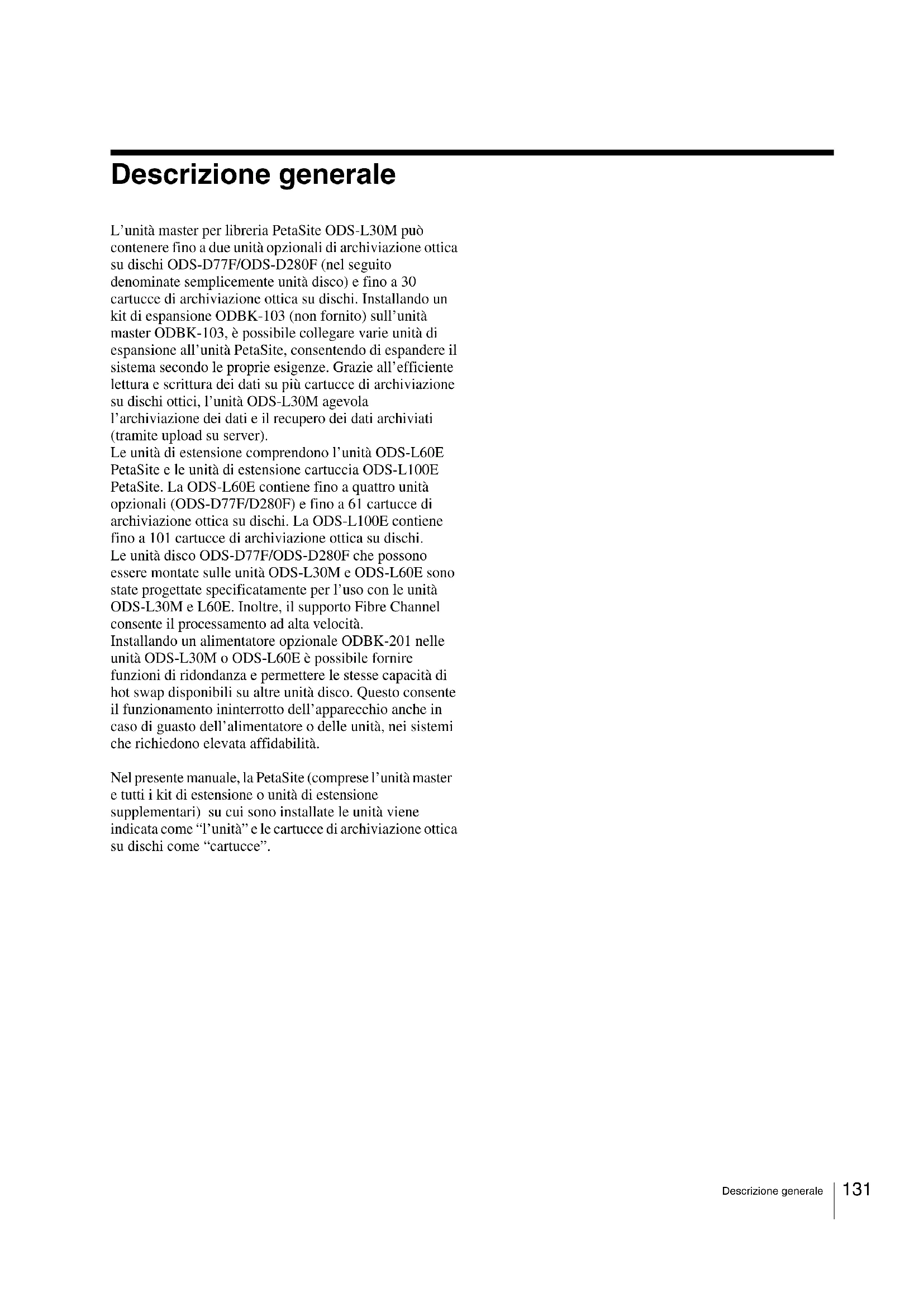 - Specifiche 31 Descrizione generale Descrizione generale L’unità master per libreria PetaSite ODS-L30M può contenere fino a due unità opzionali di archiviazione ottica su dischi ODS-D77F/ODS-D280F (nel seguito denominate semplicemente unità disco) e fino a 30 cartucce di archiviazione ottica su dischi. Installando un kit di espansione ODBK-103 (non fornito) sull’unità master ODBK-103, è possibile collegare varie unità di espansione all’unità PetaSite, consentendo di espandere il sistema secondo le proprie esigenze. Grazie all’efficiente lettura e scrittura dei dati su più cartucce di archiviazione su dischi ottici, l’unità ODS-L30M agevola l’archiviazione dei dati e il recupero dei dati archiviati (tramite upload su server). Le unità di estensione comprendono l’unità ODS-L60E PetaSite e le unità di estensione cartuccia ODS-L100E PetaSite. La ODS-L60E contiene fino a quattro unità opzionali (ODS-D77F/D280F) e fino a 61 cartucce di archiviazione ottica su dischi. La ODS-L100E contiene fino a 101 cartucce di archiviazione ottica su dischi. Le unità disco ODS-D77F/ODS-D280F che possono essere montate sulle unità ODS-L30M e ODS-L60E sono state progettate specificatamente per l’uso con le unità ODS-L30M e L60E. Inoltre, il supporto Fibre Channel consente il processamento ad alta velocità. Installando un alimentatore opzionale ODBK-201 nelle unità ODS-L30M o ODS-L60E è possibile fornire funzioni di ridondanza e permettere le stesse capacità di hot swap disponibili su altre unità disco. Questo consente il funzionamento ininterrotto dell’apparecchio anche in caso di guasto dell’alimentatore o delle unità, nei sistemi che richiedono elevata affidabilità. Nel presente manuale, la PetaSite (comprese l’unità master e tutti i kit di estensione o unità di estensione supplementari) su cui sono installate le unità viene indicata come “l’unità” e le cartucce di archiviazione ottica su dischi come “cartucce”.132 Descrizione generale Esempio di configurazione del sistema I seguenti tipi di sistema possono essere realizzati utilizzando l’unità e gli apparecchi collegati. Per informazioni dettagliate sulla configurazione del server raccomandata per la connessione di un’unità disco, scaricare le note tecniche dal sito Sony Creative Software (pagina 157). Switch Gigabit Ethernet Computer Macintosh Computer Windows Server (con applicazione HSM) Switch Fibre Channel Questo apparecchio Ethernet Conservazione Server (con applicazione MAM) Fibre Channel133 Nome e funzione dei componenti Nome e funzione dei componenti ODS-L30M Pannello anteriore Il pannello anteriore della ODS-L30M può essere rimosso e intercambiato con i pannelli anteriori delle unità di estensione ODS-L60E/L100E. La ODS-L30M verrà installata nella parte inferiore di uno stack di più unità, ma il relativo pannello anteriore potrebbe essere situato su un’unità di estensione la cui altezza consente un funzionamento più agevole. a Pulsante e indicatore On/Standby Commuta fra la modalità di accensione e la modalità standby quando gli interruttori di alimentazione principale sul retro dell’unità sono accesi. Quando l’unità è accesa, premere il pulsante per passare alla modalità standby. Sul display viene visualizzato un messaggio di conferma dello spegnimento. Servendosi dei pulsanti freccia, selezionare “Yes”, quindi premere il pulsante ENTER. L’indicatore è illuminato con luce verde quando l’apparecchio è acceso e con luce rossa quando si trova in standby. L’indicatore lampeggia con luce verde durante lo spegnimento dell’apparecchio. p. 1561