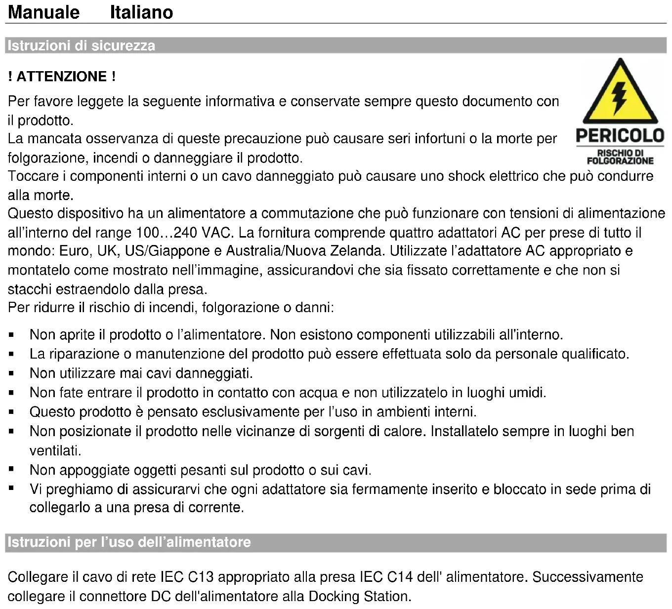 Vi preghiamo di assicurarvi che ogni adattatore sia fermamente inserito e bloccato in sede prima di collegarlo a una presa di corrente. Istruzioni per l’uso dell’alimentatore Collegare il cavo di rete IEC C13 appropriato alla presa IEC C14 dell' alimentatore. Successivamente collegare il connettore DC dell'alimentatore alla Docking Station.Manuale Italiano