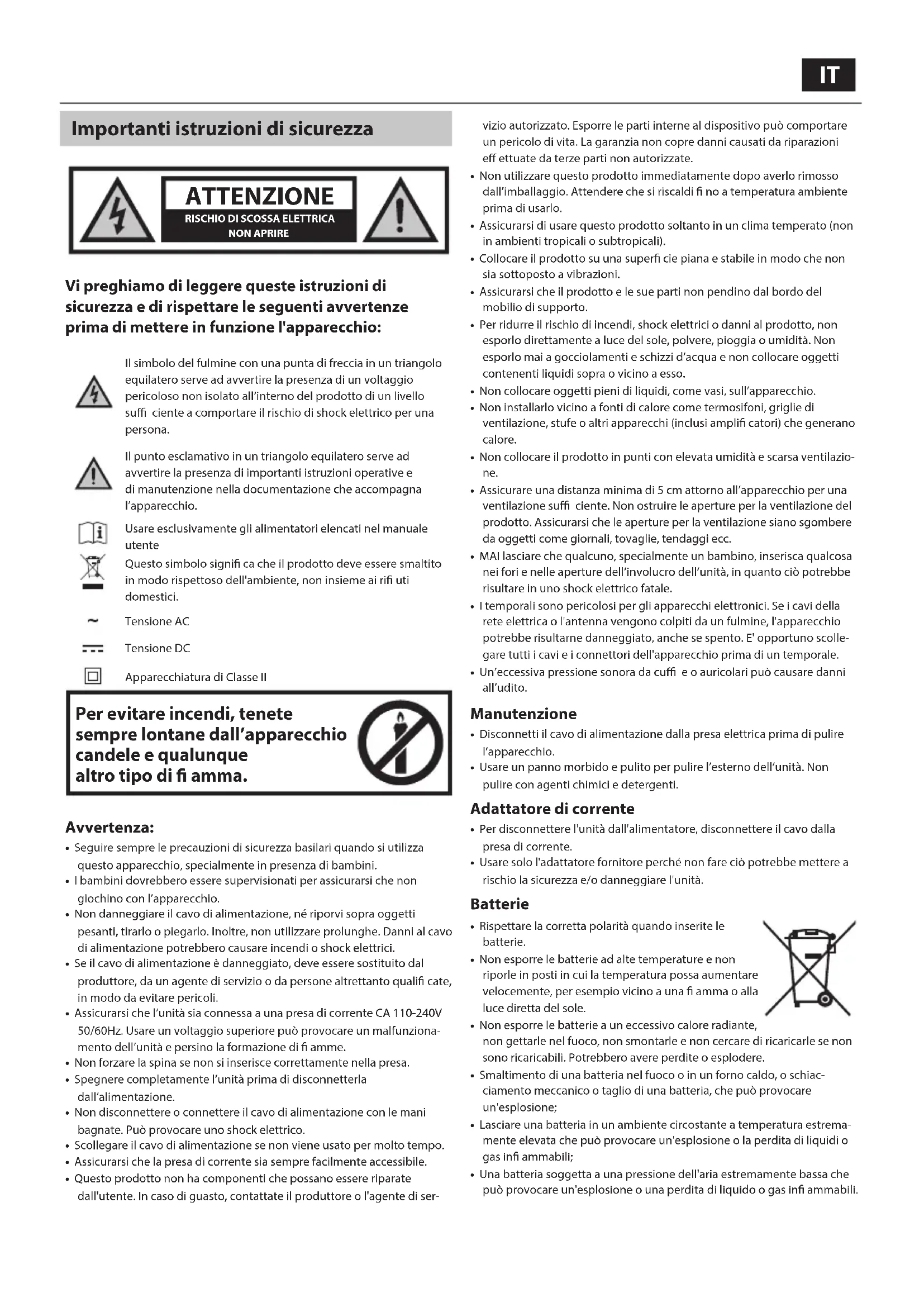 - Seguire sempre le precauzioni di sicurezza basilari quando si utilizza questo apparecchio, specialmente in presenza di bambini.• I bambini dovrebbero essere supervisionati per assicurarsi che non giochino con l’apparecchio.• Non danneggiare il cavo di alimentazione, né riporvi sopra oggetti pesanti, tirarlo o piegarlo. Inoltre, non utilizzare prolunghe. Danni al cavo di alimentazione potrebbero causare incendi o shock elettrici.• Se il cavo di alimentazione è danneggiato, deve essere sostituito dal produttore, da un agente di servizio o da persone altrettanto quali cate, in modo da evitare pericoli.• Assicurarsi che l’unità sia connessa a una presa di corrente CA 110-240V 50/60Hz. Usare un voltaggio superiore può provocare un malfunziona-mento dell’unità e persino la formazione di amme.• Non forzare la spina se non si inserisce correttamente nella presa.• Spegnere completamente l’unità prima di disconnetterla dall’alimentazione.• Non disconnettere o connettere il cavo di alimentazione con le mani bagnate. Può provocare uno shock elettrico.• Scollegare il cavo di alimentazione se non viene usato per molto tempo.• Assicurarsi che la presa di corrente sia sempre facilmente accessibile.• Questo prodotto non ha componenti che possano essere riparate dall'utente. In caso di guasto, contattate il produttore o l'agente di ser-vizio autorizzato. Esporre le parti interne al dispositivo può comportare un pericolo di vita. La garanzia non copre danni causati da riparazioni e ettuate da terze parti non autorizzate.• Non utilizzare questo prodotto immediatamente dopo averlo rimosso dall’imballaggio. Attendere che si riscaldi no a temperatura ambiente prima di usarlo.• Assicurarsi di usare questo prodotto soltanto in un clima temperato (non in ambienti tropicali o subtropicali).• Collocare il prodotto su una super cie piana e stabile in modo che non sia sottoposto a vibrazioni.• Assicurarsi che il prodotto e le sue parti non pendino dal bordo del mobilio di supporto.• Per ridurre il rischio di incendi, shock elettrici o danni al prodotto, non esporlo direttamente a luce del sole, polvere, pioggia o umidità. Non esporlo mai a gocciolamenti e schizzi d’acqua e non collocare oggetti contenenti liquidi sopra o vicino a esso.• Non collocare oggetti pieni di liquidi, come vasi, sull’apparecchio.• Non installarlo vicino a fonti di calore come termosifoni, griglie di ventilazione, stufe o altri apparecchi (inclusi ampli catori) che generano calore.• Non collocare il prodotto in punti con elevata umidità e scarsa ventilazio- ne.