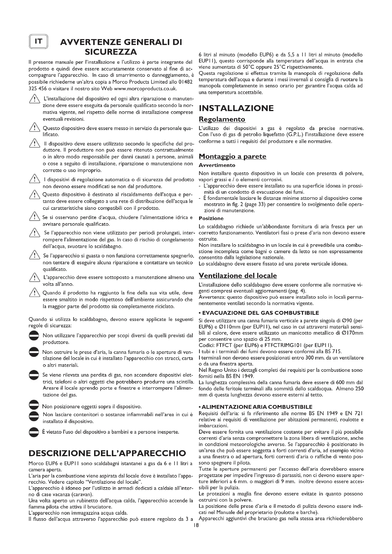 Morco EUP6 e EUP11 sono scaldabagni istantanei a gas da 6 e 11 litri a camera aperta. L’aria per la combustione viene aspirata dal locale dove è installato l’appa- recchio. Vedere capitolo “Ventilazione del locale”. L’apparecchio è idoneo per l’utilizzo in armadi dedicati a caldaie all’inter- no di case vacanza (caravan). Una volta aperto un rubinetto dell’acqua calda, l’apparecchio accende la amma pilota che attiva il bruciatore. L’apparecchio non immagazzina acqua calda. Il usso dell’acqua attraverso l’apparecchio può essere regolato da 3 a 6 litri al minuto (modello EUP6) e da 5,5 a 11 litri al minuto (modello EUP11), questo corrisponde alla temperatura dell’acqua in entrata che viene aumentata di 50°C oppure 25°C rispettivamente. Questa regolazione si effettua tramite la manopola di regolazione della temperatura dell’acqua e durante i mesi invernali si consiglia di ruotare la manopola completamente in senso orario per garantire l’acqua calda ad una temperatura accettabile. INSTALLAZIONE Regolamento L’utilizzo dei dispositivi a gas è regolato da precise normative. Con l’uso di gas di petrolio liquefatto (G.P.L.) l’installazione deve essere conforme a tutti i requisiti del produttore e alle normative. Montaggio a parete Avvertimento Non installare questo dispositivo in un locale con presenza di polvere, vapori grassi e / o elementi corrosivi. - L’apparecchio deve essere installato su una supercie idonea in prossi- mità di un condotto di evacuazione dei fumi. - È fondamentale lasciare le distanze minime attorno al dispositivo come mostrato in g. 2 (page 33) per consentire lo svolgimento delle opera- zioni di manutenzione. Posizione Lo scaldabagno richiede un’abbondante fornitura di aria fresca per un corretto funzionamento. Ventilatori ssi o prese d’aria non devono essere ostruite. Non installare lo scaldabagno in un locale in cui è prevedibile una combu- stione incompleta come bagni o camere da letto se non espressamente consentito dalla legislazione nazionale. Lo scaldabagno deve essere ssato ad una parete verticale idonea. Ventilazione del locale L’installazione dello scaldabagno deve essere conforme alle normative vi- genti compresi eventuali aggiornamenti (pag. 4). Avvertenza: questo dispositivo può essere installato solo in locali perma- nentemente ventilati secondo la normativa vigente.