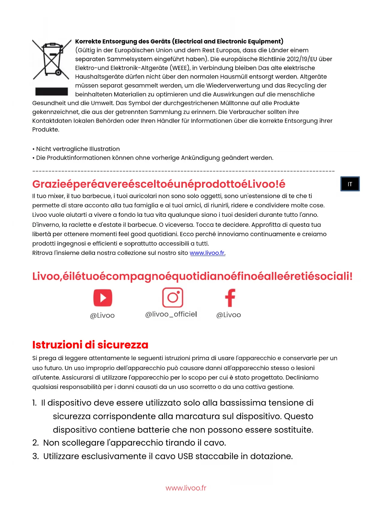 Grazie per avere scelto un prodotto Livoo! Il tuo mixer, il tuo barbecue, i tuoi auricolari non sono solo oggetti, sono un'estensione di te che ti permette di stare acconto alla tua famiglia e ai tuoi amici, di riunirli, ridere e condividere molte cose. Livoo vuole aiutarti a vivere a fondo la tua vita qualunque siano i tuoi desideri durante tutto l'anno. D'inverno, la raclette e d'estate il barbecue. O viceversa. Tocca te decidere. Approfitta di questa tua libertà per ottenere momenti feel good quotidiani. Ecco perché innoviamo continuamente e creiamo prodotti ingegnosi e efficienti e soprattutto accessibili a tutti. Ritrova l'insieme della nostra collezione sul nostro sito www.livoo.fr. Livoo, il tuo compagno quotidiano fino alle reti sociali!