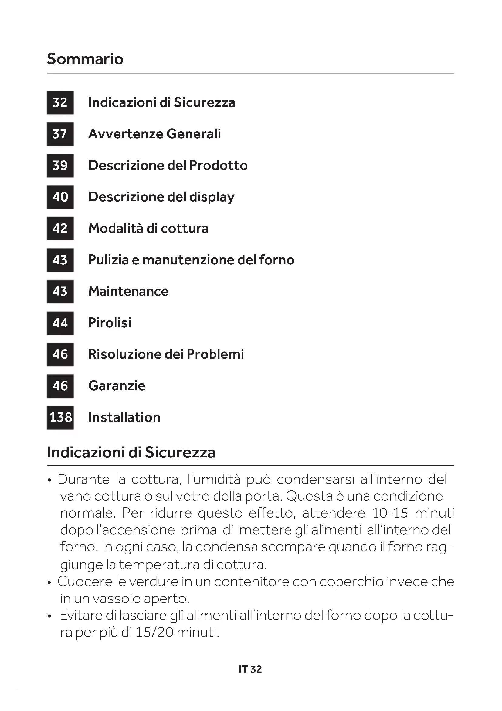 - Evitare di lasciare gli alimenti all’interno del forno dopo la cottu- ra per più di 15/20 minuti. Indicazioni di SicurezzaIT 33
