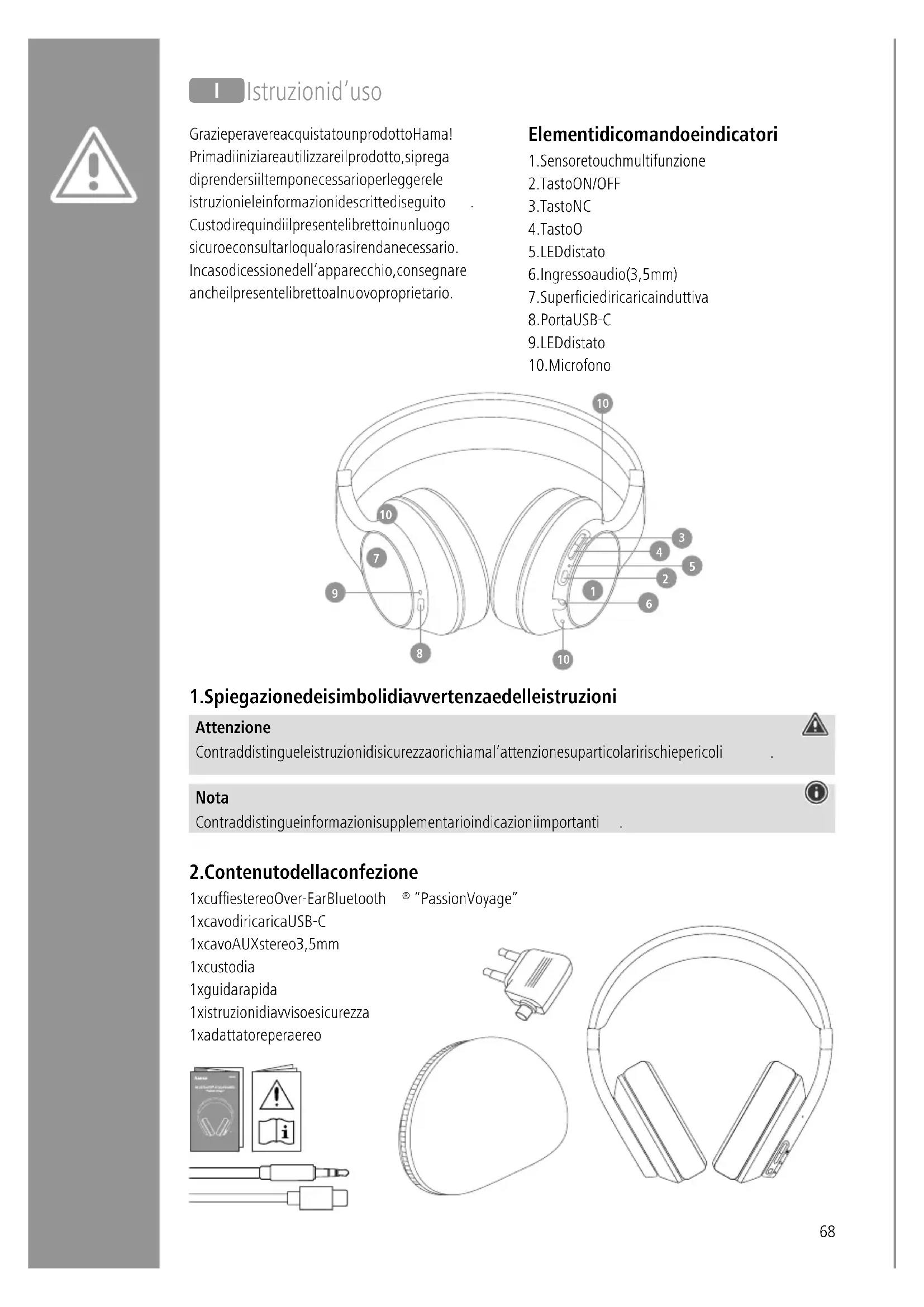 “Passion Voyage” 1x cavo di ricarica USB-C 1x cavo AUX stereo 3,5mm 1x custodia 1x guida rapida 1x istruzioni di avviso e sicurezza 1x adattatore per aereo I Istruzioni d’uso Grazie per avere acquistato un prodotto Hama! Prima di iniziare a utilizzare il prodotto, si prega di prendersi il tempo necessario per leggere le istruzioni e le informazioni descritte di seguito