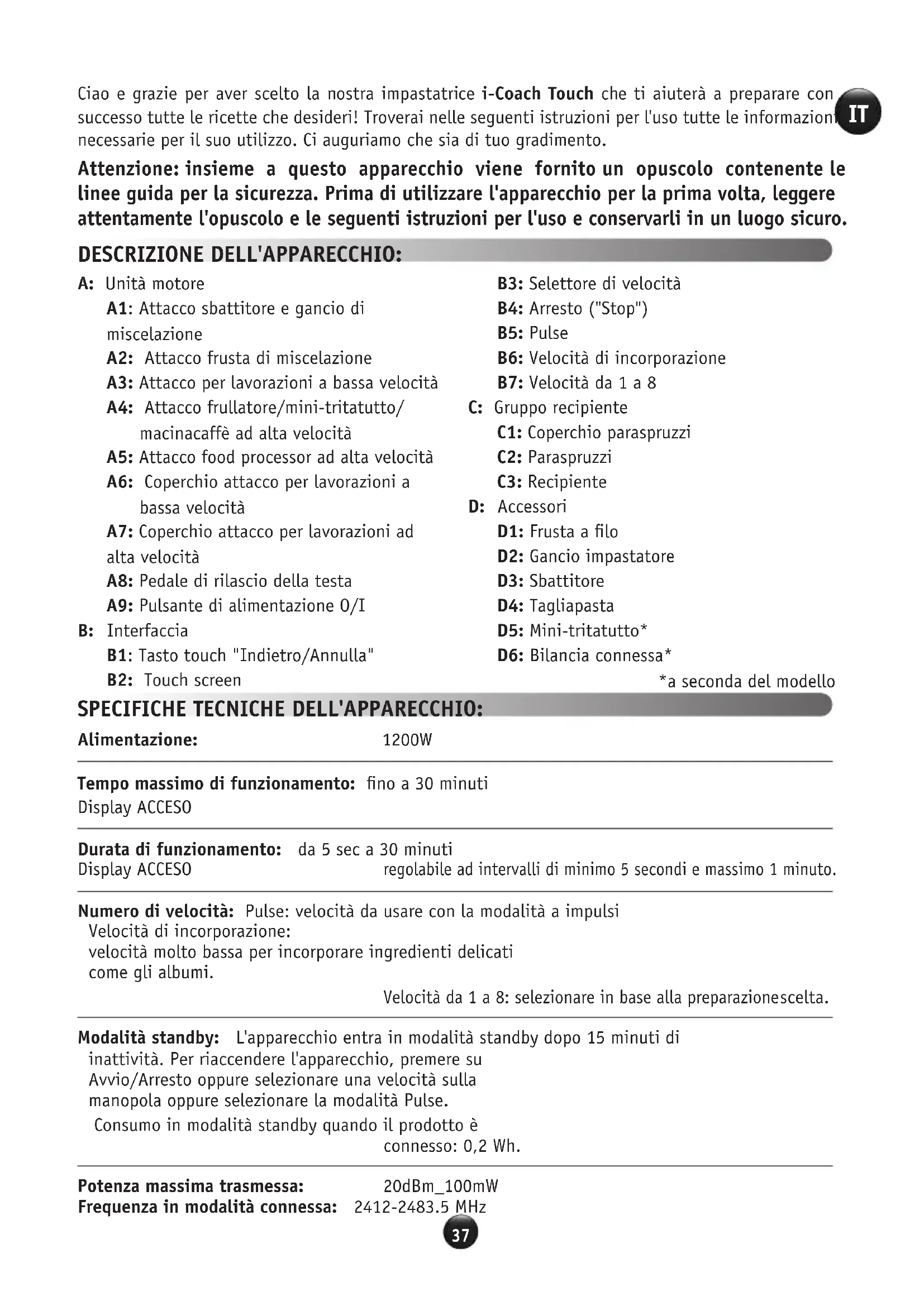 Ciao e grazie per aver scelto la nostra impastatrice i-Coach Touch che ti aiuterà a preparare con successo tutte le ricette che desideri! Troverai nelle seguenti istruzioni per l'uso tutte le informazioni necessarie per il suo utilizzo. Ci auguriamo che sia di tuo gradimento. Attenzione: insieme a questo apparecchio viene fornito un opuscolo contenente le linee guida per la sicurezza. Prima di utilizzare l'apparecchio per la prima volta, leggere attentamente l'opuscolo e le seguenti istruzioni per l'uso e conservarli in un luogo sicuro. DESCRIZIONE DELL'APPARECCHIO: A: Unità motore A1: Attacco sbattitore e gancio di miscelazione A2: Attacco frusta di miscelazione A3: Attacco per lavorazioni a bassa velocità A4: Attacco frullatore/mini-tritatutto/ macinacaffè ad alta velocità A5: Attacco food processor ad alta velocità A6: Coperchio attacco per lavorazioni a bassa velocità A7: Coperchio attacco per lavorazioni ad alta velocità A8: Pedale di rilascio della testa A9: Pulsante di alimentazione O/I B: Interfaccia B1: Tasto touch "Indietro/Annulla" B2: Touch screen B3: Selettore di velocità B4: Arresto ("Stop") B5: Pulse B6: Velocità di incorporazione B7: Velocità da 1 a 8 C: Gruppo recipiente C1: Coperchio paraspruzzi C2: Paraspruzzi C3: Recipiente D: Accessori D1: Frusta a filo D2: Gancio impastatore D3: Sbattitore D4: Tagliapasta D5: Mini-tritatutto* D6: Bilancia connessa* *a seconda del modello SPECIFICHE TECNICHE DELL'APPARECCHIO: Alimentazione: 1200W Tempo massimo di funzionamento: fino a 30 minuti Display ACCESO Durata di funzionamento: da 5 sec a 30 minuti Display ACCESO regolabile ad intervalli di minimo 5 secondi e massimo 1 minuto. Numero di velocità: Pulse: velocità da usare con la modalità a impulsi Velocità di incorporazione: velocità molto bassa per incorporare ingredienti delicati come gli albumi. Velocità da 1 a 8: selezionare in base alla preparazione scelta. Modalità standby: L'apparecchio entra in modalità standby dopo 15 minuti di inattività. Per riaccendere l'apparecchio, premere su Avvio/Arresto oppure selezionare una velocità sulla manopola oppure selezionare la modalità Pulse. Consumo in modalità standby quando il prodotto è connesso: 0,2 Wh. Potenza massima trasmessa: 20dBm_100mW Frequenza in modalità connessa: 2412-2483.5 MHz38 39 ENEN FRUSTA (D1) Per sbattere le uova, montare la panna ed emulsionare le preparazioni. Di seguito sono riportate le ricette nel dettaglio. Non usare mai la frusta a filo per impasti pesanti. Albumi Max 10 V8 1 min e 45 sec Maionese Max 1 L V7 4 min Pastella per crêpe Max 2 L V1 - V3