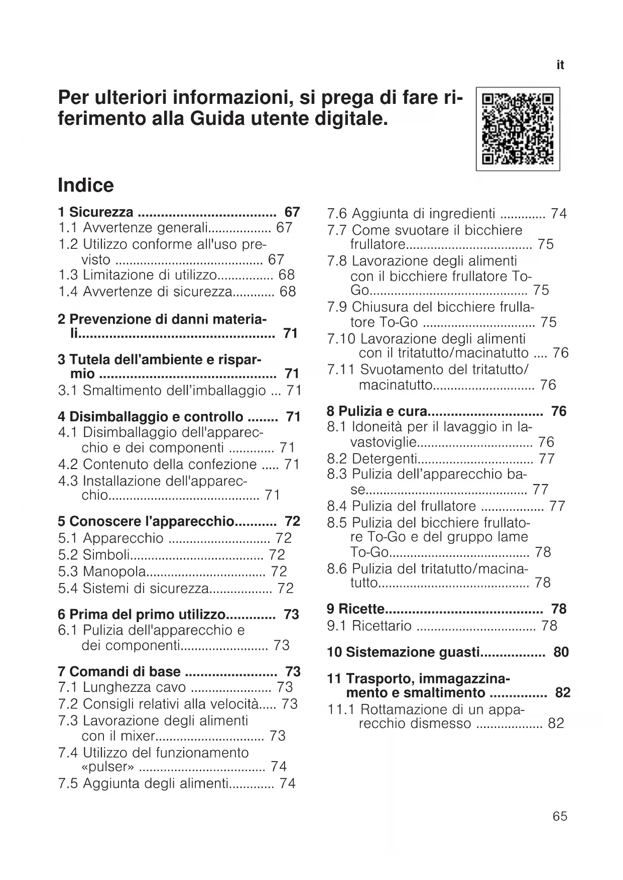 Per ulteriori informazioni, si prega di fare ri- ferimento alla Guida utente digitale. Indice 1 Sicurezza ....................................67