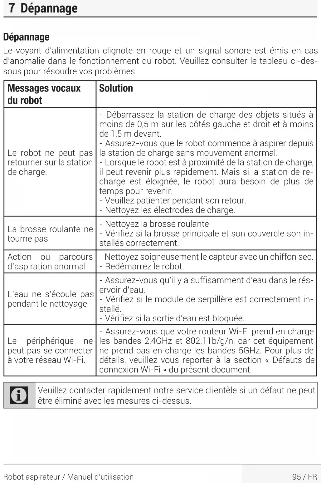 Si consiglia di rimuovere il supporto del mop da un lato, scaricare il serbatoio dell'ac- qua, sciacquare il mop con acqua e poi lasciarlo asciugare dopo ogni lavaggio. Il mop è lavabile in lavatrice.123 / IT Robot aspirapolvere / Manuale d'uso Risoluzione dei problemi L’indicatore di alimentazione lampeggia di colore rosso e il cicalino emette un se- gnale acustico in caso di anomalie nel funzionamento del robot di spazzatura. Per risolvere i problemi, consultare la seguente tabella. Prompt vocali Soluzione Il robot non può avviarsi. - Accertarsi che il robot sia collegato all'alimentazione. - Accertarsi che la batteria sia completamente carica. - Qualora il problema persista, resettare il robot. Il robot improvvisa- mente smette di funzionare. - Controllare se il robot è bloccato o ostruito da ostacoli. - Controllare se la batteria è troppo scarica. - Qualora il problema persista, spegnere il sistema, atten- dere 3 secondi e riavviarlo. Impossibile eseguire un programma di pulizia - Ci sono troppi ostacoli intorno al dock di ricarica. Collo- care il dock di ricarica in un'area priva di ostacoli. - L'aspirapolvere robot è troppo lontano dal dock di ricar- ica. Avvicinare l'aspirapolvere robot al dock di ricarica e riprovare. - Accertarsi che la stazione di ricarica sia collegata e che sia alimentata. Aspirazione troppo debole - Controllare che la bocca di aspirazione non sia ostruita. - Svuotare il contenitore della polvere. - Pulire i filtri con acqua. - Controllare se i filtri sono bagnati a causa dell'acqua o di altri liquidi presenti sul pavimento. Lasciare che i filtri si asciughino in modo naturale prima dell'uso. Non è possibile cari- care la macchina - Verificare che il dock di ricarica sia collegato corretta- mente all'alimentazione e che la spia si accenda quando l'alimentazione è attiva. - Quando il robot è collegato in modo normale al dock di ricarica, la spia si spegne. - Se il robot è collegato al dock di ricarica, ma la spia non si spegne e il robot non risponde, servirsi di un panno asciutto per pulire la parte dell'asta di ricarica sul fondo dell'aspirapolvere robot e la parte di ricarica del dock di ricarica, quindi riprovare. - Se non è ancora possibile caricare il robot dopo aver es- eguito le operazioni sopra descritte, contattare il servizio post-vendita o il proprio rivenditore. 7 Risoluzione dei problemi124 / IT Robot aspirapolvere / Manuale d'uso 7 Risoluzione dei problemi Risoluzione dei problemi L’indicatore di alimentazione lampeggia di colore rosso e il cicalino emette un se- gnale acustico in caso di anomalie nel funzionamento del robot di spazzatura. Per risolvere i problemi, consultare la seguente tabella. Prompt vocali Soluzione Il robot non può tornare al dock di ri- carica. - Liberare il dock di ricarica dagli oggetti che si trovano a 0,5 m sui lati destro e sinistro e a 1,5 m davanti. - Accertarsi che il robot parta dal dock di ricarica senza eseguire movimenti anomali. - Quando il robot è vicino al dock di ricarica, può tornare indietro più velocemente. Ma se il dock di ricarica è lon- tano, il robot avrà bisogno di più tempo per tornare. - Attendere il suo ritorno. - Pulire gli elettrodi di carica. La spazzola rotante non gira - Pulire la spazzola di rotante. - Verificare che la spazzola principale e il coperchio della spazzola principale siano installati correttamente. Azione anomala o per- corso di pulizia del ro- bot non corretto - Pulire accuratamente il sensore con un panno asciutto. - Riavviare il robot. Nessun rilascio di ac- qua durante la pulizia - Accertarsi che ci sia acqua a sufficienza nel serbatoio dell'acqua. - Controllare se il modulo mocio è installato corretta- mente. - Controllare se l'uscita dell'acqua è bloccata. La macchina non ri- esce a connettersi alla rete Wi-Fi. - Accertarsi che il router Wi-Fi supporti le bande 2.4GHz e 802.11b/g/n, dato che questa apparecchiatura non sup- porta le bande 5GHz. Per maggiori dettagli, consultare la sezione "Guasti nella connessione Wi-Fi".
