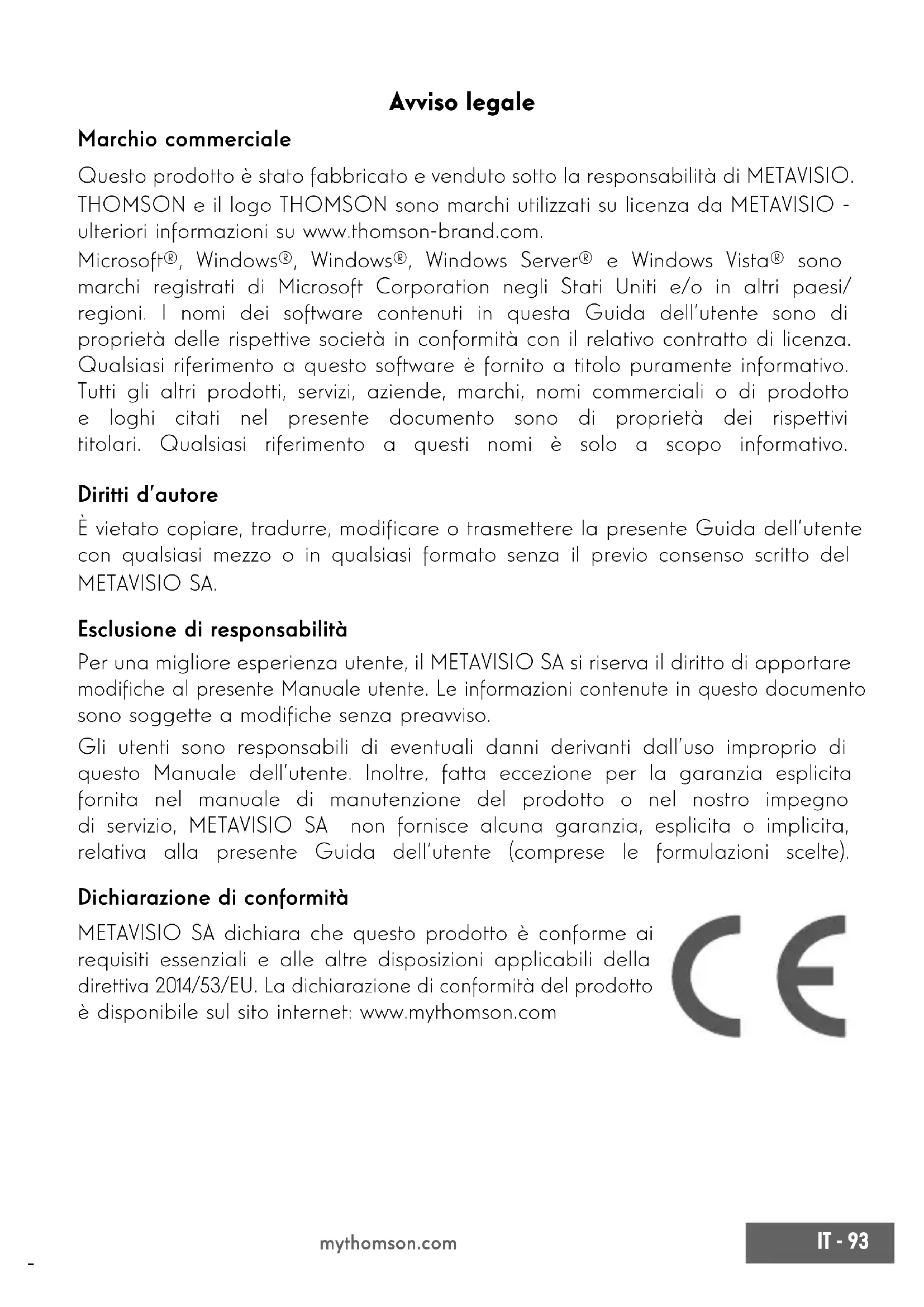 mythomson.com Avviso legale Marchio commerciale Questo prodotto è stato fabbricato e venduto sotto la responsabilità di METAVISIO. THOMSON e il logo THOMSON sono marchi utilizzati su licenza da METAVISIO - ulteriori informazioni su www.thomson-brand.com. Microsoft®, Windows®, Windows®, Windows Server® e Windows Vista® sono marchi registrati di Microsoft Corporation negli Stati Uniti e/o in altri paesi/ regioni. I nomi dei software contenuti in questa Guida dell’utente sono di proprietà delle rispettive società in conformità con il relativo contratto di licenza. Qualsiasi riferimento a questo software è fornito a titolo puramente informativo. Tutti gli altri prodotti, servizi, aziende, marchi, nomi commerciali o di prodotto e loghi citati nel presente documento sono di proprietà dei rispettivi titolari. Qualsiasi riferimento a questi nomi è solo a scopo informativo. Diritti d’autore È vietato copiare, tradurre, modicare o trasmettere la presente Guida dell’utente con qualsiasi mezzo o in qualsiasi formato senza il previo consenso scritto del METAVISIO SA. Esclusione di responsabilità Per una migliore esperienza utente, il METAVISIO SA si riserva il diritto di apportare modiche al presente Manuale utente. Le informazioni contenute in questo documento sono soggette a modiche senza preavviso. Gli utenti sono responsabili di eventuali danni derivanti dall’uso improprio di questo Manuale dell’utente. Inoltre, fatta eccezione per la garanzia esplicita fornita nel manuale di manutenzione del prodotto o nel nostro impegno di servizio, METAVISIO SA non fornisce alcuna garanzia, esplicita o implicita, relativa alla presente Guida dell’utente (comprese le formulazioni scelte). Dichiarazione di conformità METAVISIO SA dichiara che questo prodotto è conforme ai requisiti essenziali e alle altre disposizioni applicabili della direttiva 2014/53/EU. La dichiarazione di conformità del prodotto è disponibile sul sito internet: www.mythomson.com94 - IT Guida dell’utente - NEO - 15.6’’ mythomson.com - Importanti indicazioni di sicurezza - Questa unità deve essere utilizzata in un ambiente con una temperatura ambiente compresa tra 5°C (41°F) e 35°C (95°F). Non esporre l’apparecchio alla pioggia o all’umidità e tenerlo lontano da liquidi. In caso di spruzzi d’acqua o altri liquidi sull’unità, spegnere immediatamente l’unità e attendere che sia completamente asciutta prima di riaccenderla. Non esporre l’apparecchio direttamente alla radiazione solare. Non utilizzare solventi forti, detergenti liquidi o altri prodotti chimici sulla supercie dell’unità o in prossimità di essa per evitare la corrosione o il deterioramento della supercie dell’unità. Non esporre la fotocamera a un ambiente polveroso. Non utilizzare l’unità durante una fuga di gas. Non esporre il dispositivo a forti campi magnetici o elettrici. È possibile far passare il dispositivo attraverso i rilevatori di raggi X dell’aeroporto. Tuttavia, si raccomanda di non far passare il dispositivo attraverso i portali di rilevamento magnetico e di non esporlo a rivelatori portatili. Non mettere niente, non disporre nessun oggetto sul dispositivo. Non appoggiare l’unità su una supercie irregolare o instabile. Assicurarsi di proteggere l’unità da cadute o qualsiasi altro impatto che possa danneggiarla. Non lasciare l’apparecchio acceso o caricato sulle ginocchia o su qualsiasi altra parte del corpo per evitare il rischio di lesioni dovute al calore. Spegnere l’apparecchio prima di trasportarlo o coprirlo con un materiale che non consente una circolazione ottimale dell’aria. Non utilizzare cavi di alimentazione, accessori o altri dispositivi danneggiati con l’apparecchio. Si raccomanda l’uso esclusivo degli accessori (alimentatore, cavi, ecc.) forniti con l’apparecchio.IT - 95 mythomson.com Utilizzare solo le batterie originali. La sostituzione della batteria con una batteria errata può causare un rischio di esplosione. Non smontare, modicare o riparare l’apparecchio da solo, in quanto ciò potrebbe invalidare la garanzia. Si prega di eseguire regolarmente il backup dei contenuti importanti per evitare la perdita di dati. La nostra azienda non si assume alcuna responsabilità per la perdita o la rimozione degli elementi contenuti nel dispositivo a causa di un uso improprio dell’hardware o del software, della mancanza di manutenzione o di qualsiasi altro evento accidentale. Questo prodotto è stato progettato per consentire un corretto riciclaggio di parti e componenti. Il simbolo di un bidone barrato indica che l’apparecchio non deve essere smaltito insieme ai riuti urbani. Consultare le normative locali per lo smaltimento dei dispositivi elettronici. Il simbolo di un bidone barrato indica che la batteria non deve essere smaltita insieme ai riuti urbani. Consultare le normative locali per lo smaltimento delle batterie. Per evitare possibili danni all’udito, non ascoltare livelli sonori elevati per lunghi periodi di tempo.96 - IT Guida dell’utente - NEO - 15.6’’ mythomson.comIT - 97 mythomson.com98 - IT Guida dell’utente - NEO - 15.6’’ mythomson.com - Accensione - Nota : caricare il dispositivo Thomson prima di utilizzarlo per la prima volta. Caricare la batteria del dispositivo Collegare l’adattatore CA a una presa elettrica con messa a terra. ATTENZIONE : Leggere attentamente le seguenti istruzioni relative alla batteria del dispositivo THOMSON: