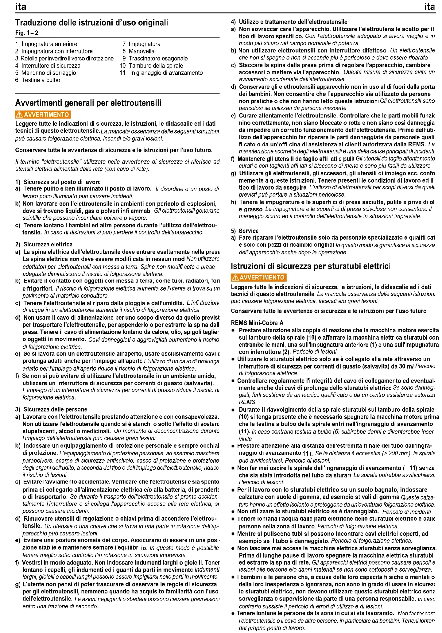 Leggere tutte le indicazioni di sicurezza, le istruzioni, le didascalie ed i dati tecnici di questo elettroutensile. La mancata osservanza delle seguenti istruzioni può causare folgorazione elettrica, incendi e/o gravi lesioni. Conservare tutte le avvertenze di sicurezza e le istruzioni per l'uso futuro. REMS Mini-Cobra