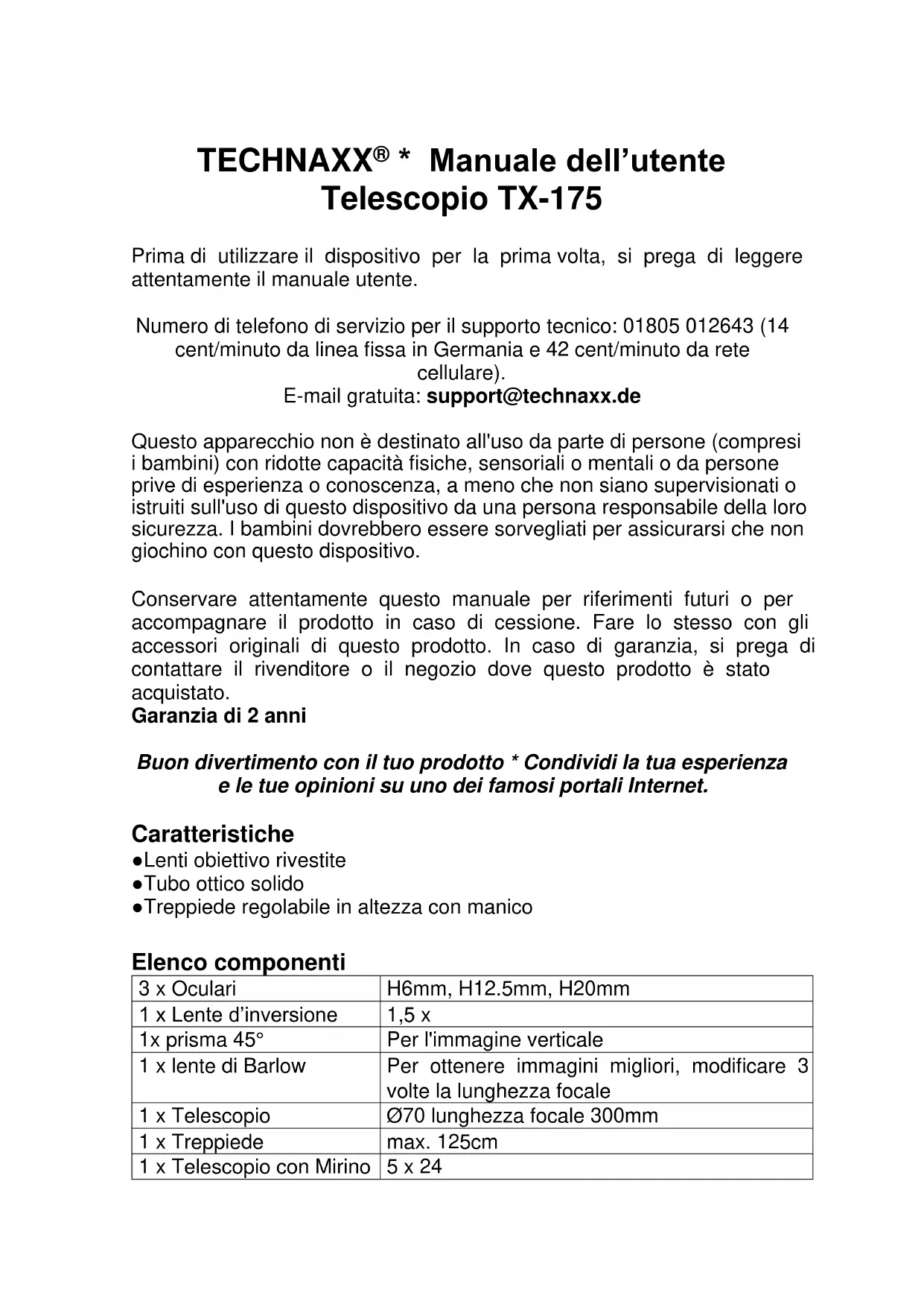 - Manuale dell’utente Telescopio TX-175 Prima di utilizzare il dispositivo per la prima volta, si prega di leggere attentamente il manuale utente. Numero di telefono di servizio per il supporto tecnico: 01805 012643 (14 cent/minuto da linea fissa in Germania e 42 cent/minuto da rete cellulare). E-mail gratuita: support@technaxx.de Questo apparecchio non è destinato all'uso da parte di persone (compresi i bambini) con ridotte capacità fisiche, sensoriali o mentali o da persone prive di esperienza o conoscenza, a meno che non siano supervisionati o istruiti sull'uso di questo dispositivo da una persona responsabile della loro sicurezza. I bambini dovrebbero essere sorvegliati per assicurarsi che non giochino con questo dispositivo. Conservare attentamente questo manuale per riferimenti futuri o per accompagnare il prodotto in caso di cessione. Fare lo stesso con gli accessori originali di questo prodotto. In caso di garanzia, si prega di contattare il rivenditore o il negozio dove questo prodotto è stato acquistato. Garanzia di 2 anni Buon divertimento con il tuo prodotto * Condividi la tua esperienza e le tue opinioni su uno dei famosi portali Internet. Caratteristiche ●Lenti obiettivo rivestite ●Tubo ottico solido ●Treppiede regolabile in altezza con manico Elenco componenti 3 x Oculari H6mm, H12.5mm, H20mm 1 x Lente d’inversione 1,5 x 1x prisma 45° Per l'immagine verticale 1 x lente di Barlow Per ottenere immagini migliori, modificare 3 volte la lunghezza focale 1 x Telescopio Ø70 lunghezza focale 300mm 1 x Treppiede max. 125cm 1 x Telescopio con Mirino 5 x 241 x Filtro luce verde Consente un notevole miglioramento del contrasto, ad esempio se si osserva la luna 1 x Filtro luce solare Riduzione della luce solare Peso/Dimensioni 1,8kg / 45 x 45 x 11cm Panoramica del prodotto
