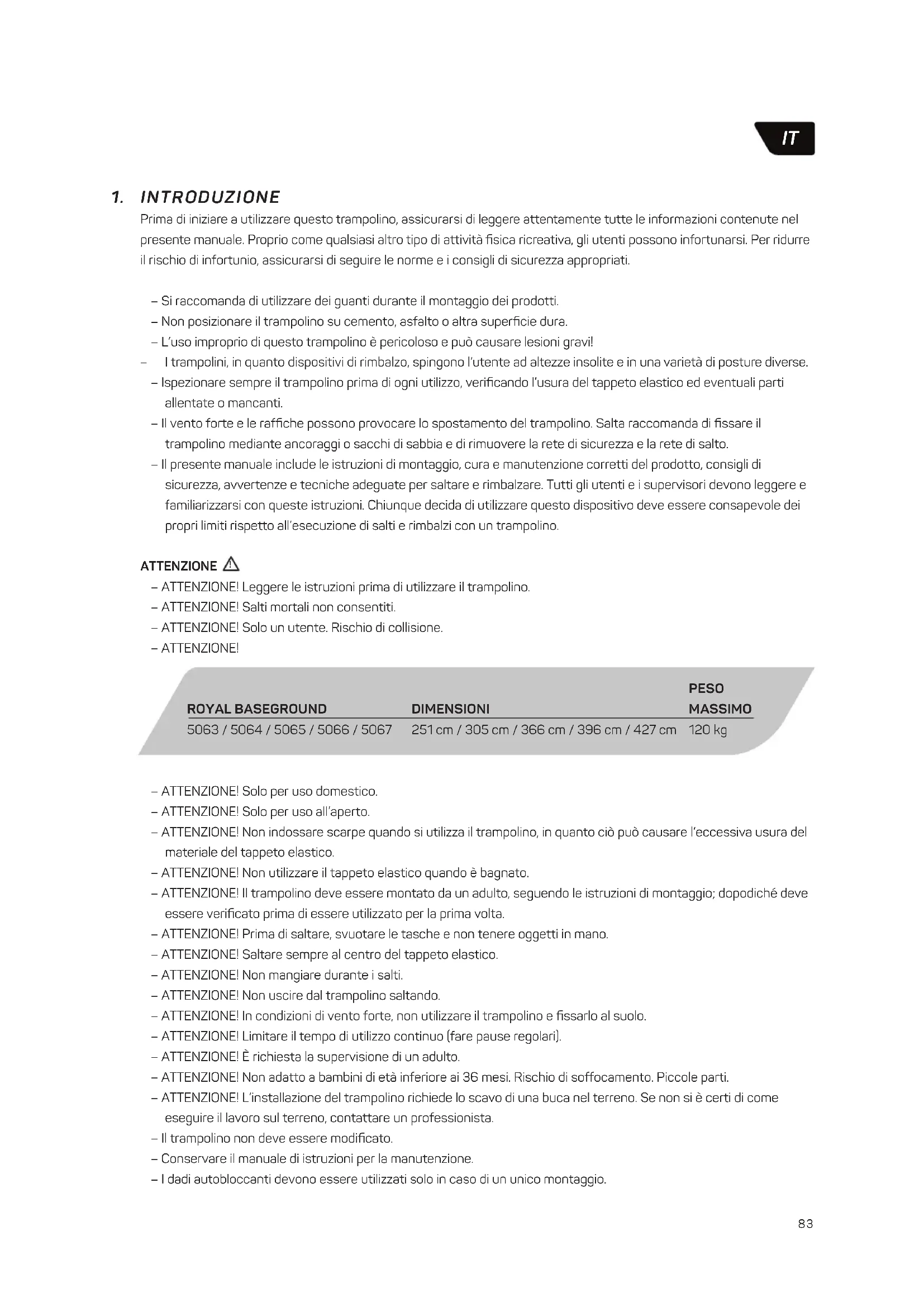 – ATTENZIONE! Solo per uso domestico. – ATTENZIONE! Solo per uso all’aperto. – ATTENZIONE! Non indossare scarpe quando si utilizza il trampolino, in quanto ciò può causare l’eccessiva usura del materiale del tappeto elastico. – ATTENZIONE! Non utilizzare il tappeto elastico quando è bagnato. – ATTENZIONE! Il trampolino deve essere montato da un adulto, seguendo le istruzioni di montaggio; dopodiché deve essere verificato prima di essere utilizzato per la prima volta. – ATTENZIONE! Prima di saltare, svuotare le tasche e non tenere oggetti in mano. – ATTENZIONE! Saltare sempre al centro del tappeto elastico. – ATTENZIONE! Non mangiare durante i salti. – ATTENZIONE! Non uscire dal trampolino saltando. – ATTENZIONE! In condizioni di vento forte, non utilizzare il trampolino e fissarlo al suolo. – ATTENZIONE! Limitare il tempo di utilizzo continuo (fare pause regolari). – ATTENZIONE! È richiesta la supervisione di un adulto. – ATTENZIONE! Non adatto a bambini di età inferiore ai 36 mesi. Rischio di soffocamento. Piccole parti. – ATTENZIONE! L’installazione del trampolino richiede lo scavo di una buca nel terreno. Se non si è certi di come eseguire il lavoro sul terreno, contattare un professionista. – Il trampolino non deve essere modificato. – Conservare il manuale di istruzioni per la manutenzione. – I dadi autobloccanti devono essere utilizzati solo in caso di un unico montaggio. ROYAL BASEGROUND 5063 / 5064 / 5065 / 5066 / 5067 DIMENSIONI 251 cm / 305 cm / 366 cm / 396 cm / 427 cm PESO MASSIMO 120 kg
