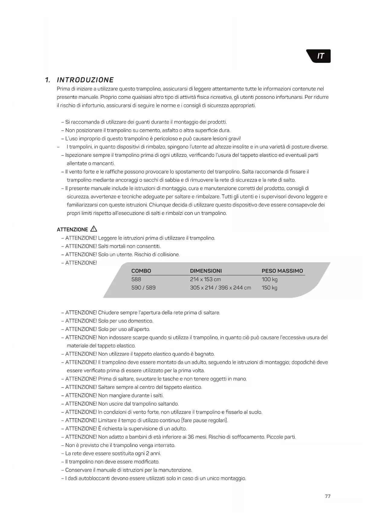 – ATTENZIONE! Chiudere sempre l’apertura della rete prima di saltare. – ATTENZIONE! Solo per uso domestico. – ATTENZIONE! Solo per uso all’aperto. – ATTENZIONE! Non indossare scarpe quando si utilizza il trampolino, in quanto ciò può causare l’eccessiva usura del materiale del tappeto elastico. – ATTENZIONE! Non utilizzare il tappeto elastico quando è bagnato. – ATTENZIONE! Il trampolino deve essere montato da un adulto, seguendo le istruzioni di montaggio; dopodiché deve essere verificato prima di essere utilizzato per la prima volta. – ATTENZIONE! Prima di saltare, svuotare le tasche e non tenere oggetti in mano. – ATTENZIONE! Saltare sempre al centro del tappeto elastico. – ATTENZIONE! Non mangiare durante i salti. – ATTENZIONE! Non uscire dal trampolino saltando. – ATTENZIONE! In condizioni di vento forte, non utilizzare il trampolino e fissarlo al suolo. – ATTENZIONE! Limitare il tempo di utilizzo continuo (fare pause regolari). – ATTENZIONE! È richiesta la supervisione di un adulto. – ATTENZIONE! Non adatto a bambini di età inferiore ai 36 mesi. Rischio di soffocamento. Piccole parti. – Non è previsto che il trampolino venga interrato. – La rete deve essere sostituita ogni 2 anni. – Il trampolino non deve essere modificato. – Conservare il manuale di istruzioni per la manutenzione. – I dadi autobloccanti devono essere utilizzati solo in caso di un unico montaggio. COMBO
