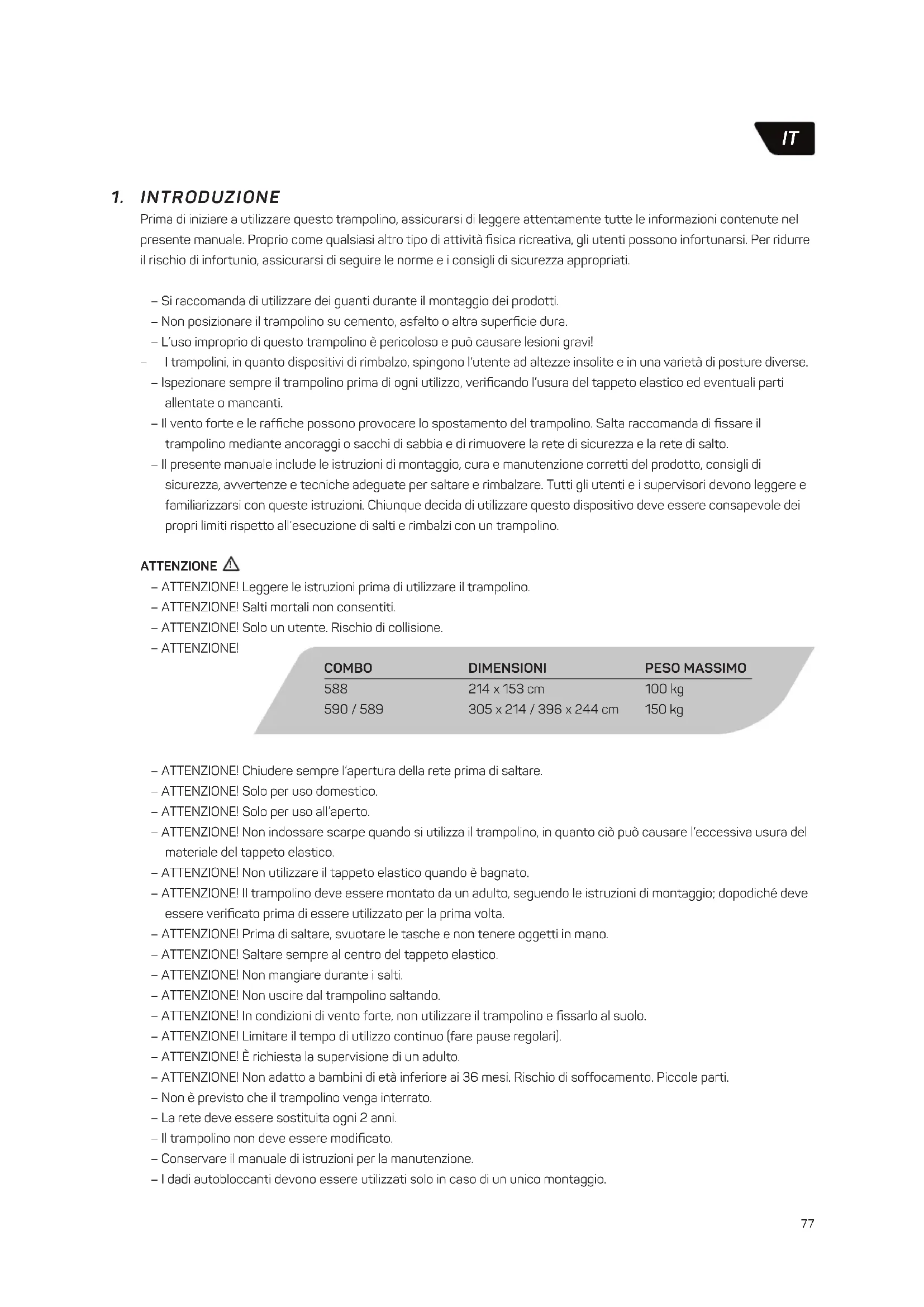 – ATTENZIONE! Chiudere sempre l’apertura della rete prima di saltare. – ATTENZIONE! Solo per uso domestico. – ATTENZIONE! Solo per uso all’aperto. – ATTENZIONE! Non indossare scarpe quando si utilizza il trampolino, in quanto ciò può causare l’eccessiva usura del materiale del tappeto elastico. – ATTENZIONE! Non utilizzare il tappeto elastico quando è bagnato. – ATTENZIONE! Il trampolino deve essere montato da un adulto, seguendo le istruzioni di montaggio; dopodiché deve essere verificato prima di essere utilizzato per la prima volta. – ATTENZIONE! Prima di saltare, svuotare le tasche e non tenere oggetti in mano. – ATTENZIONE! Saltare sempre al centro del tappeto elastico. – ATTENZIONE! Non mangiare durante i salti. – ATTENZIONE! Non uscire dal trampolino saltando. – ATTENZIONE! In condizioni di vento forte, non utilizzare il trampolino e fissarlo al suolo. – ATTENZIONE! Limitare il tempo di utilizzo continuo (fare pause regolari). – ATTENZIONE! È richiesta la supervisione di un adulto. – ATTENZIONE! Non adatto a bambini di età inferiore ai 36 mesi. Rischio di soffocamento. Piccole parti. – Non è previsto che il trampolino venga interrato. – La rete deve essere sostituita ogni 2 anni. – Il trampolino non deve essere modificato. – Conservare il manuale di istruzioni per la manutenzione. – I dadi autobloccanti devono essere utilizzati solo in caso di un unico montaggio. COMBO