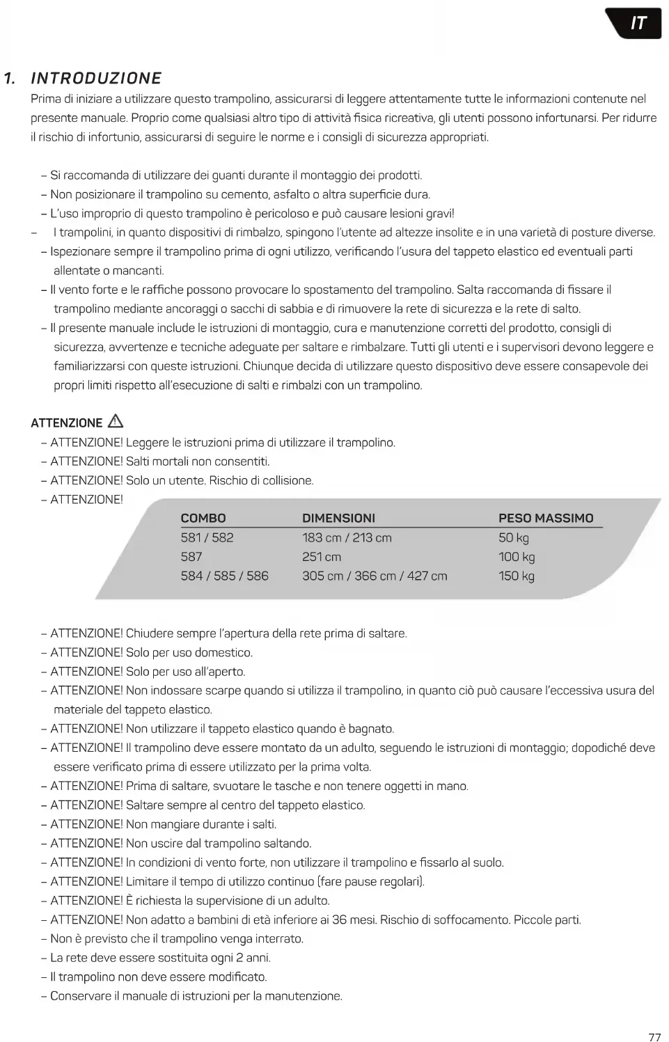 584 / 585 / 586 DIMENSIONI 183 cm / 213 cm 251 cm 305 cm / 366 cm / 427 cm PESO MASSIMO 50 kg 100 kg 150 kg !78 – I dadi autobloccanti devono essere utilizzati solo in caso di un unico montaggio. – L’uso improprio di questo trampolino può causare lesioni gravi. – Ispezionare prima dell’uso e sostituire eventuali parti usurate, difettose o mancanti. – Attenersi a tutti i requisiti di sicurezza inclusi in questo prodotto. – Non adatto a bambini di età inferiore ai 36 mesi a causa della loro scarsa abilità. – Mantenere a distanza da fiamme libere. – Non appendersi o arrampicarsi sulla rete di sicurezza e non scalciarla o tagliarla. – Indossare abiti privi di chiusure a cordoncino, ganci, asole o qualsiasi cosa che possa rimanere impigliata alla barriera. – Non applicare nulla al trampolino che non sia un accessorio approvato dal produttore. – Entrare e uscire dalla recinzione utilizzando esclusivamente la sua porta o l’apertura della barriera designata a tale scopo. – Consultare sempre un medico prima di effettuare qualsiasi attività fisica!