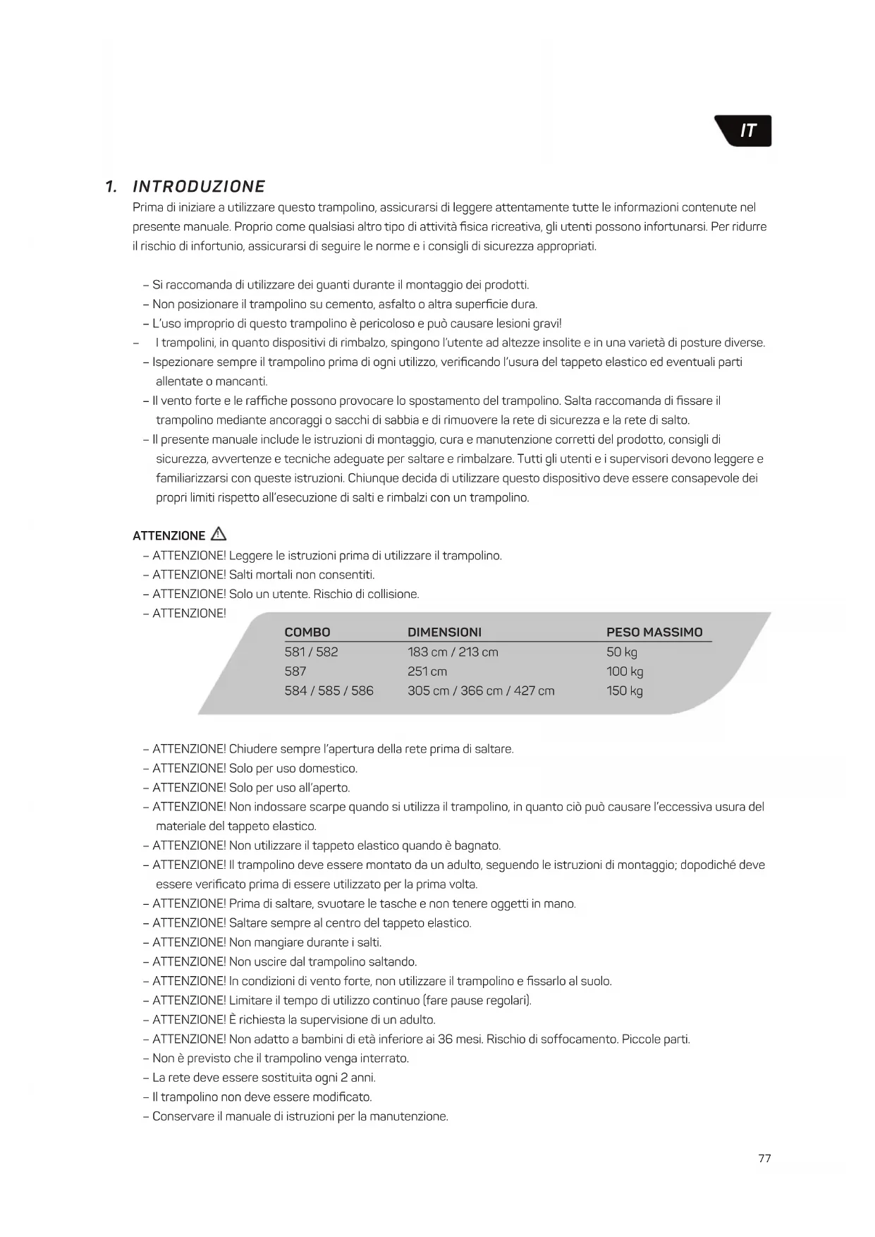 584 / 585 / 586 DIMENSIONI 183 cm / 213 cm 251 cm 305 cm / 366 cm / 427 cm PESO MASSIMO 50 kg 100 kg 150 kg !78 – I dadi autobloccanti devono essere utilizzati solo in caso di un unico montaggio. – L’uso improprio di questo trampolino può causare lesioni gravi. – Ispezionare prima dell’uso e sostituire eventuali parti usurate, difettose o mancanti. – Attenersi a tutti i requisiti di sicurezza inclusi in questo prodotto. – Non adatto a bambini di età inferiore ai 36 mesi a causa della loro scarsa abilità. – Mantenere a distanza da fiamme libere. – Non appendersi o arrampicarsi sulla rete di sicurezza e non scalciarla o tagliarla. – Indossare abiti privi di chiusure a cordoncino, ganci, asole o qualsiasi cosa che possa rimanere impigliata alla barriera. – Non applicare nulla al trampolino che non sia un accessorio approvato dal produttore. – Entrare e uscire dalla recinzione utilizzando esclusivamente la sua porta o l’apertura della barriera designata a tale scopo. – Consultare sempre un medico prima di effettuare qualsiasi attività fisica!