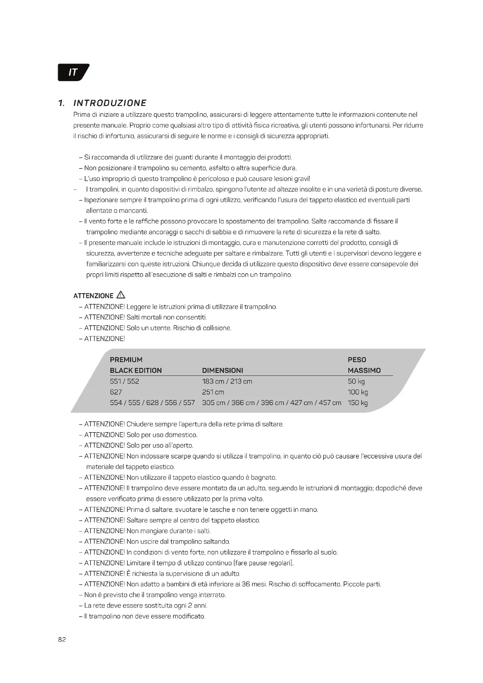 – ATTENZIONE! Chiudere sempre l’apertura della rete prima di saltare. – ATTENZIONE! Solo per uso domestico. – ATTENZIONE! Solo per uso all’aperto. – ATTENZIONE! Non indossare scarpe quando si utilizza il trampolino, in quanto ciò può causare l’eccessiva usura del materiale del tappeto elastico. – ATTENZIONE! Non utilizzare il tappeto elastico quando è bagnato. – ATTENZIONE! Il trampolino deve essere montato da un adulto, seguendo le istruzioni di montaggio; dopodiché deve essere verificato prima di essere utilizzato per la prima volta. – ATTENZIONE! Prima di saltare, svuotare le tasche e non tenere oggetti in mano. – ATTENZIONE! Saltare sempre al centro del tappeto elastico. – ATTENZIONE! Non mangiare durante i salti. – ATTENZIONE! Non uscire dal trampolino saltando. – ATTENZIONE! In condizioni di vento forte, non utilizzare il trampolino e fissarlo al suolo. – ATTENZIONE! Limitare il tempo di utilizzo continuo (fare pause regolari). – ATTENZIONE! È richiesta la supervisione di un adulto. – ATTENZIONE! Non adatto a bambini di età inferiore ai 36 mesi. Rischio di soffocamento. Piccole parti. – Non è previsto che il trampolino venga interrato. – La rete deve essere sostituita ogni 2 anni. – Il trampolino non deve essere modificato. PREMIUM BLACK EDITION 551 / 552