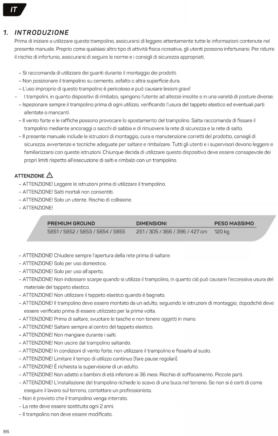 PREMIUM GROUND 5851 / 5852 / 5853 / 5854 / 5855 DIMENSIONI 251 / 305 / 366 / 396 / 427 cm PESO MASSIMO 120 kg !87 – Conservare il manuale di istruzioni per la manutenzione. – I dadi autobloccanti devono essere utilizzati solo in caso di un unico montaggio. – L’uso improprio di questo trampolino può causare lesioni gravi. – Ispezionare prima dell’uso e sostituire eventuali parti usurate, difettose o mancanti. – Attenersi a tutti i requisiti di sicurezza inclusi in questo prodotto. – Non adatto a bambini di età inferiore ai 36 mesi a causa della loro scarsa abilità. – Mantenere a distanza da fiamme libere. – Non appendersi o arrampicarsi sulla rete di sicurezza e non scalciarla o tagliarla. – Indossare abiti privi di chiusure a cordoncino, ganci, asole o qualsiasi cosa che possa rimanere impigliata alla barriera. – Non applicare nulla al trampolino che non sia un accessorio approvato dal produttore. – Entrare e uscire dalla recinzione utilizzando esclusivamente la sua porta o l’apertura della barriera designata a tale scopo. – La buca di posizionamento non deve accumulare acqua (è necessario perciò un drenaggio) e deve essere possibile pulirla durante la manutenzione. – Consultare sempre un medico prima di effettuare qualsiasi attività fisica!