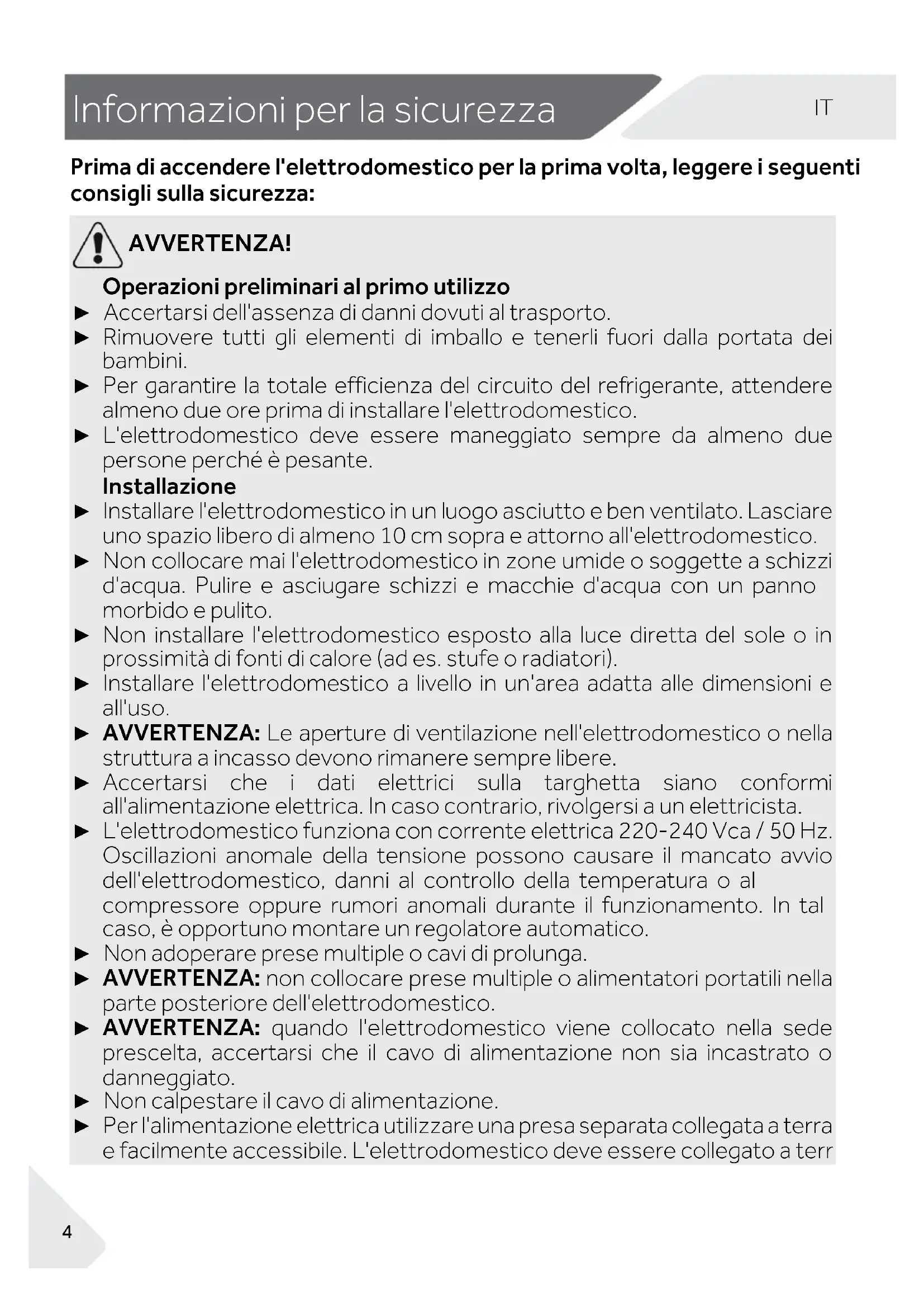 Informazi oni per la sicurezza Prima di accendere l'elettrodomestico per la prima volta, leggere i seguenti consigli sulla sicurezza: AVVERTENZA! Operazioni preliminari al primo utilizzo ► Accertarsi dell'assenza di danni dovuti al trasporto. ► Rimuovere tutti gli elementi di imballo e tenerli fuori dalla portata dei bambini. ► Per garantire la totale efficienza del circuito del refrigerante, attendere almeno due ore prima di installare l'elettrodomestico. ► L'elettrodomestico deve essere maneggiato sempre da almeno due persone perché è pesante. Installazione ► Installare l'elettrodomestico in un luogo asciutto e ben ventilato. Lasciare uno spazio libero di almeno 10 cm sopra e attorno all'elettrodomestico. ► Non collocare mai l'elettrodomestico in zone umide o soggette a schizzi d'acqua. Pulire e asciugare schizzi e macchie d'acqua con un panno morbido e pulito. ► Non installare l'elettrodomestico esposto alla luce diretta del sole o in prossimità di fonti di calore (ad es. stufe o radiatori). ► Installare l'elettrodomestico a livello in un'area adatta alle dimensioni e all'uso. ► AVVERTENZA: Le aperture di ventilazione nell'elettrodomestico o nella struttura a incasso devono rimanere sempre libere. ► Accertarsi che i dati elettrici sulla targhetta siano conformi all'alimentazione elettrica. In caso contrario, rivolgersi a un elettricista. ► L'elettrodomestico funziona con corrente elettrica 220-240 Vca / 50 Hz. Oscillazioni anomale della tensione possono causare il mancato avvio dell'elettrodomestico, danni al controllo della temperatura o al compressore oppure rumori anomali durante il funzionamento. In tal caso, è opportuno montare un regolatore automatico. ► Non adoperare prese multiple o cavi di prolunga. ► AVVERTENZA: non collocare prese multiple o alimentatori portatili nella parte posteriore dell'elettrodomestico. ► AVVERTENZA: quando l'elettrodomestico viene collocato nella sede prescelta, accertarsi che il cavo di alimentazione non sia incastrato o danneggiato. ► Non calpestare il cavo di alimentazione. ► Per l'alimentazione elettrica utilizzare una presa separata collegata a terra e facilmente accessibile. L'elettrodomestico deve essere collegato a terra.5