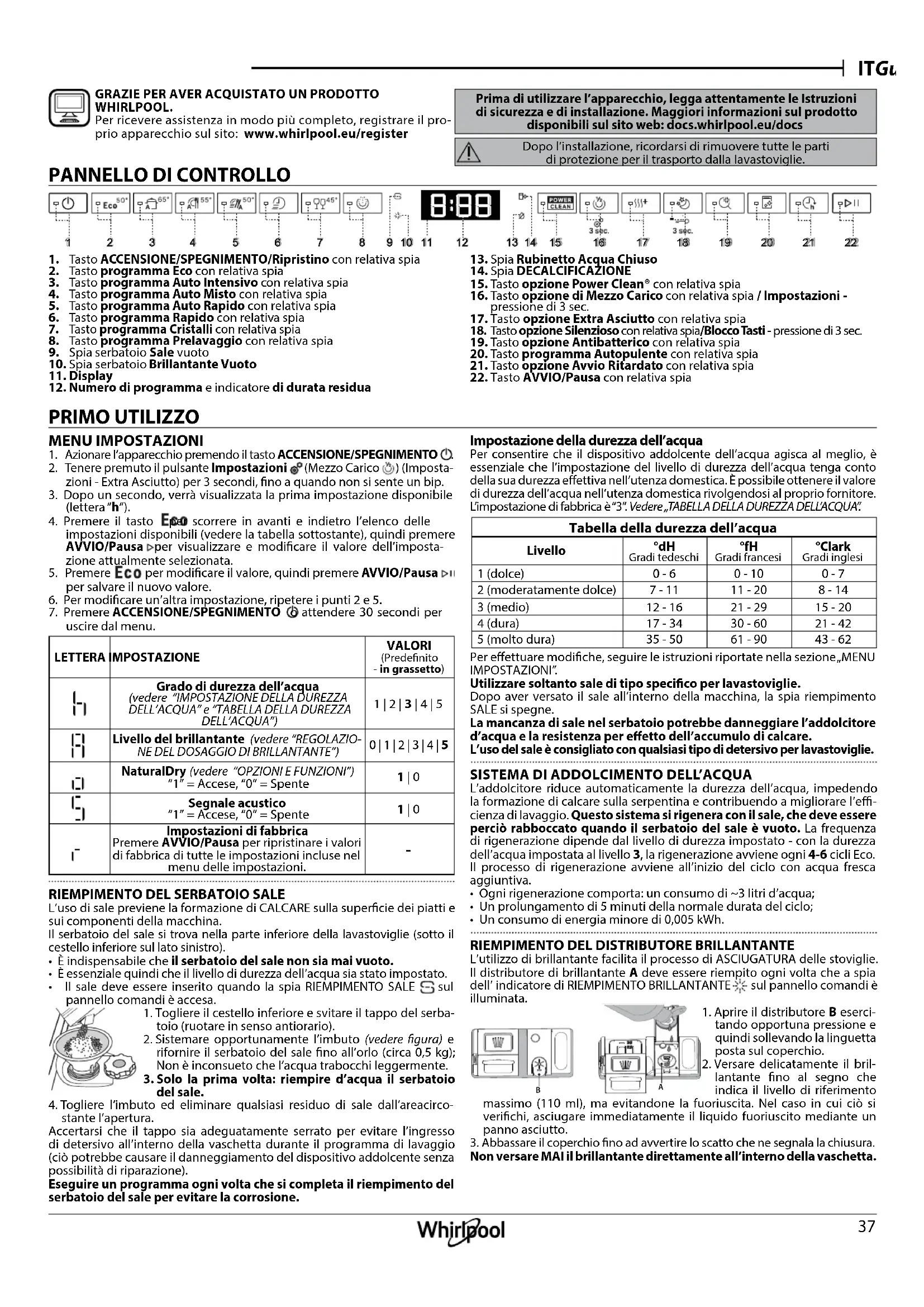 stante l’apertura. Accertarsi che il tappo sia adeguatamente serrato per evitare l’ingresso di detersivo all’interno della vaschetta durante il programma di lavaggio (ciò potrebbe causare il danneggiamento del dispositivo addolcente senza possibilità di riparazione). Eseguire un programma ogni volta che si completa il riempimento del serbatoio del sale per evitare la corrosione. Impostazione della durezza dell’acqua Per consentire che il dispositivo addolcente dell’acqua agisca al meglio, è essenziale che l’impostazione del livello di durezza dell’acqua tenga conto della sua durezza eettiva nell’utenza domestica. È possibile ottenere il valore di durezza dell’acqua nell’utenza domestica rivolgendosi al proprio fornitore. L’impostazione di fabbrica è “3”. Vedere „TABELLA DELLA DUREZZA DELL’ACQUA”. Tabella della durezza dell’acqua Livello °dH Gradi tedeschi °fH Gradi francesi °Clark Gradi inglesi 1 (dolce) 0 - 6 0 - 10 0 - 7 2 (moderatamente dolce) 7 - 11 11 - 20 8 - 14 3 (medio) 12 - 16 21 - 29 15 - 20 4 (dura) 17 - 34 30 - 60 21 - 42 5 (molto dura) 35 - 50 61 - 90 43 - 62 Per eettuare modiche, seguire le istruzioni riportate nella sezione „MENU IMPOSTAZIONI”. Utilizzare soltanto sale di tipo specico per lavastoviglie. Dopo aver versato il sale all’interno della macchina, la spia riempimento SALE si spegne. La mancanza di sale nel serbatoio potrebbe danneggiare l’addolcitore d’acqua e la resistenza per eetto dell’accumulo di calcare. L’uso del sale è consigliato con qualsiasi tipo di detersivo per lavastoviglie.