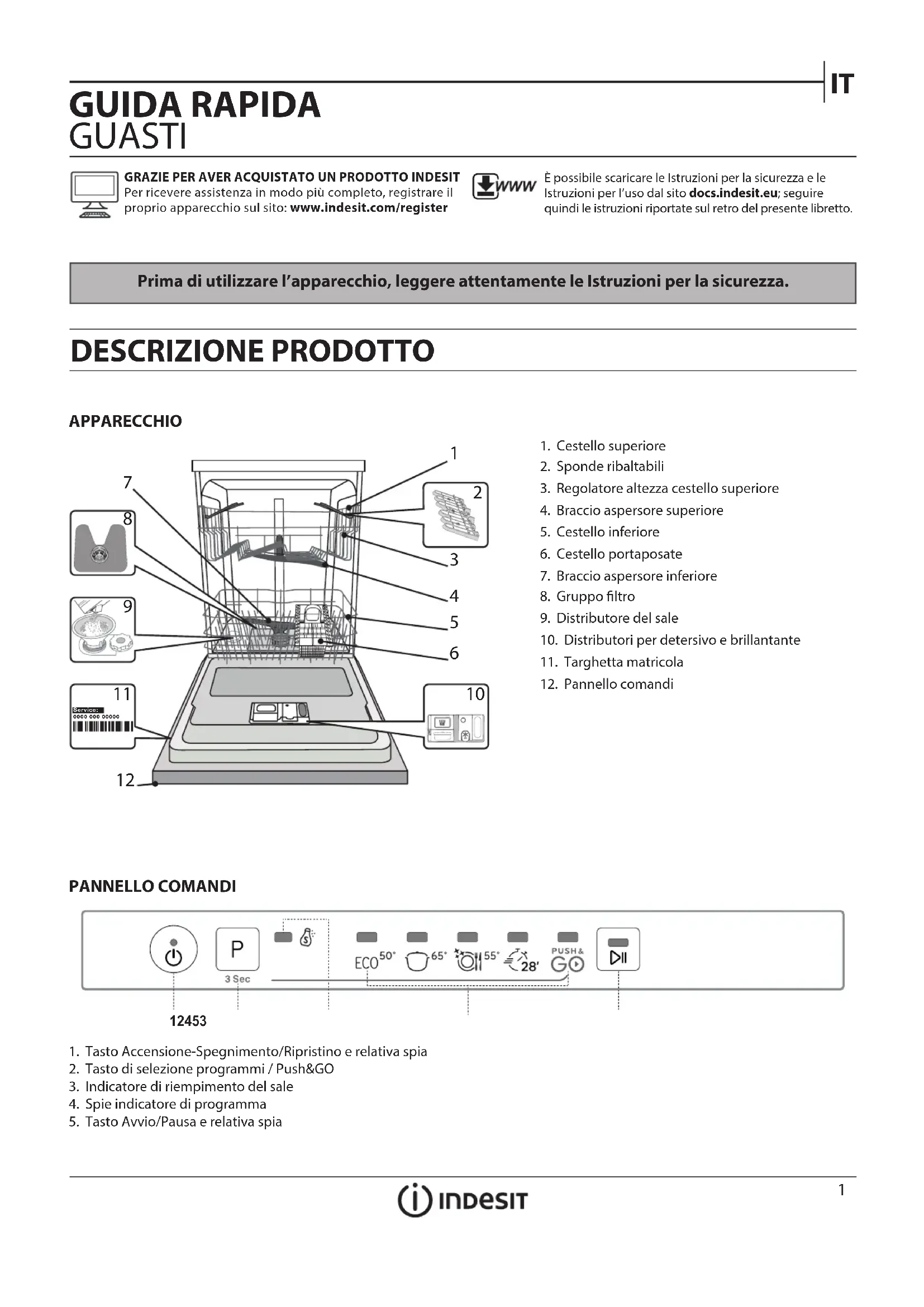 Prima di utilizzare l’apparecchio, leggere attentamente le Istruzioni per la sicurezza. APPARECCHIO DESCRIZIONE PRODOTTO 1. Tasto Accensione-Spegnimento/Ripristino e relativa spia2. Tasto di selezione programmi / Push&GO3. Indicatore di riempimento del sale4. Spie indicatore di programma 5. Tasto Avvio/Pausa e relativa spia GUIDA RAPIDA GUASTI PANNELLO COMANDI 1. Cestello superiore2. Sponde ribaltabili3. Regolatore altezza cestello superiore4. Braccio aspersore superiore5. Cestello inferiore6. Cestello portaposate7. Braccio aspersore inferiore8. Gruppo ltro9. Distributore del sale10. Distributori per detersivo e brillantante11. Targhetta matricola12. Pannello comandi0000 000 00000 Service: