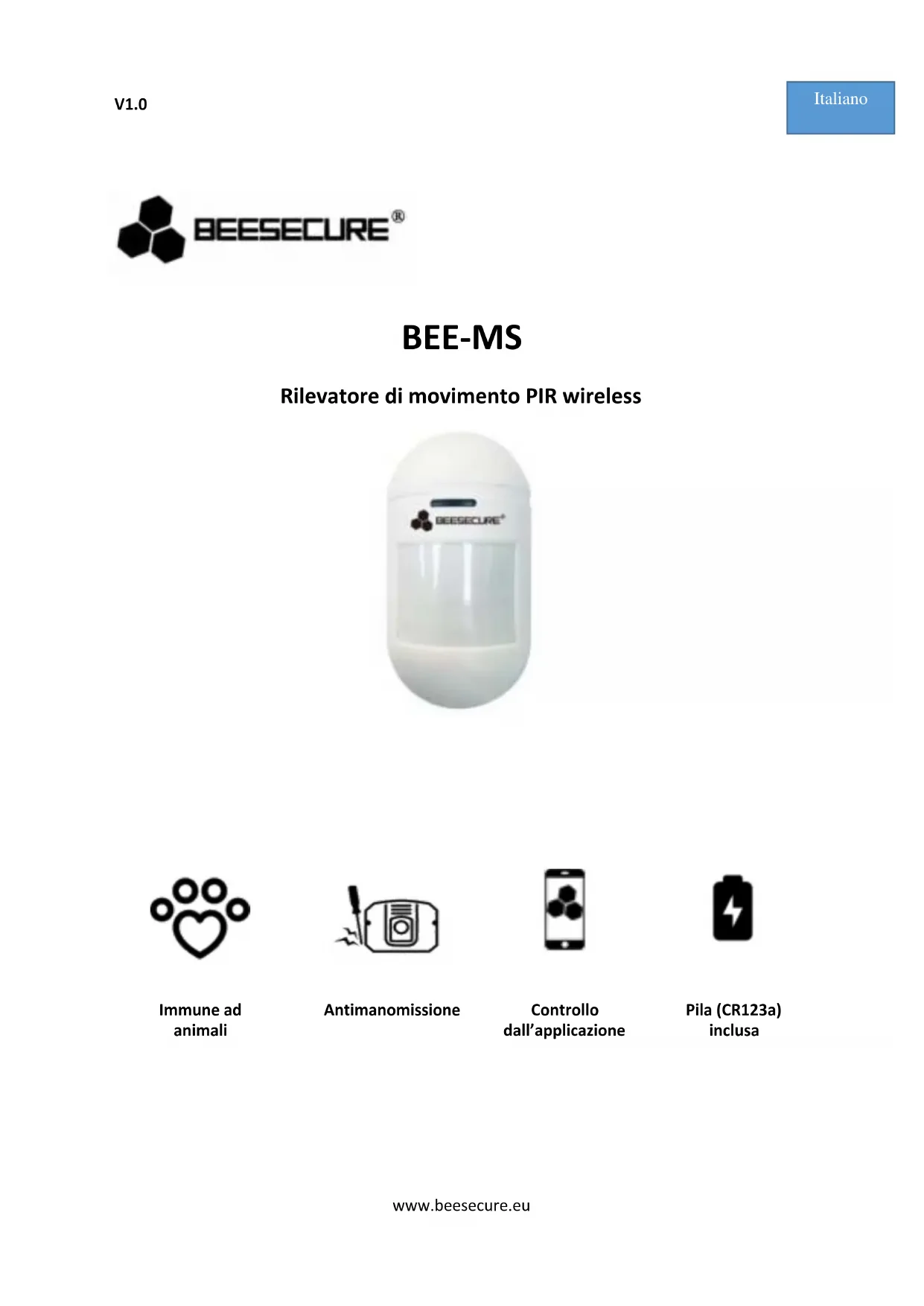 Immune ad animali Antimanomissione Controllo dall’applicazione Pila (CR123a) inclusaV1.0 www.beesecure.eu Italiano Grazie per aver scelto il sensore di movimento immune agli animali BEE-MS di BeeSecure. BEE-MS è un sensore di movimento infrarosso passivo, senza cavi ed immune agli animali domestici, con elevata precisione nel rilevare il movimento in un’area monitorata designata. Il sensore di movimento non rileverà un animale domestico che pesi meno di 25kg per evitare falsi allarmi. Ogni volta che viene rilevato una dimensione maggiore (più di 25kg) riceverà un messaggio di allarme tramite una notifica sullo smartphone. E’ possibile configurare il sensore di movimento a distanza tramite l’applicazione BeeSecure (BEE-HUB richiesto). Si assicuri di leggere il libretto di istruzioni in prima di utilizzare il BEE-MS. Leggi il libretto di istruzioni completo online per aggiungere e modificare il dispositivo dall'applicazione, scansiona il codice QR qui sotto. Scarica l’Applicazione