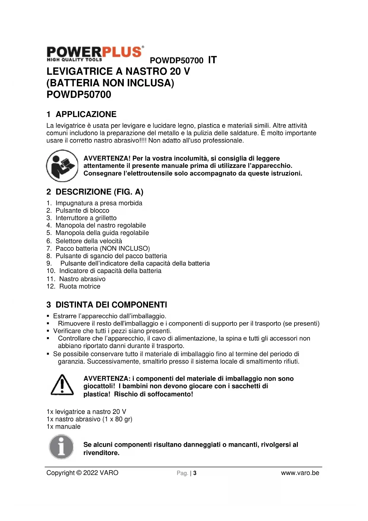 Prima di tentare di mettere in funzione la levigatrice, acquisire dimestichezza con tutte le funzioni operative e i requisiti di sicurezza. Avvertenza! La batteria deve sempre essere rimossa dall’apparecchio durante l’assemblaggio dei componenti, l’esecuzione di regolazioni, la pulizia o quando l’apparecchio non è in uso. Scollegare la batteria per evitare l’avvio accidentale che potrebbe essere causa di gravi lesioni. Non usare per levigare superfici con intonaco o malta (ATTENZIONE : in questo caso la garanzia non sarà più valida ) poiché potrebbe intasare il motore (spazzole, cuscinetti, ...).POWDP50700 IT Copyright © 2022 VARO Pag. | 9 www.varo.be