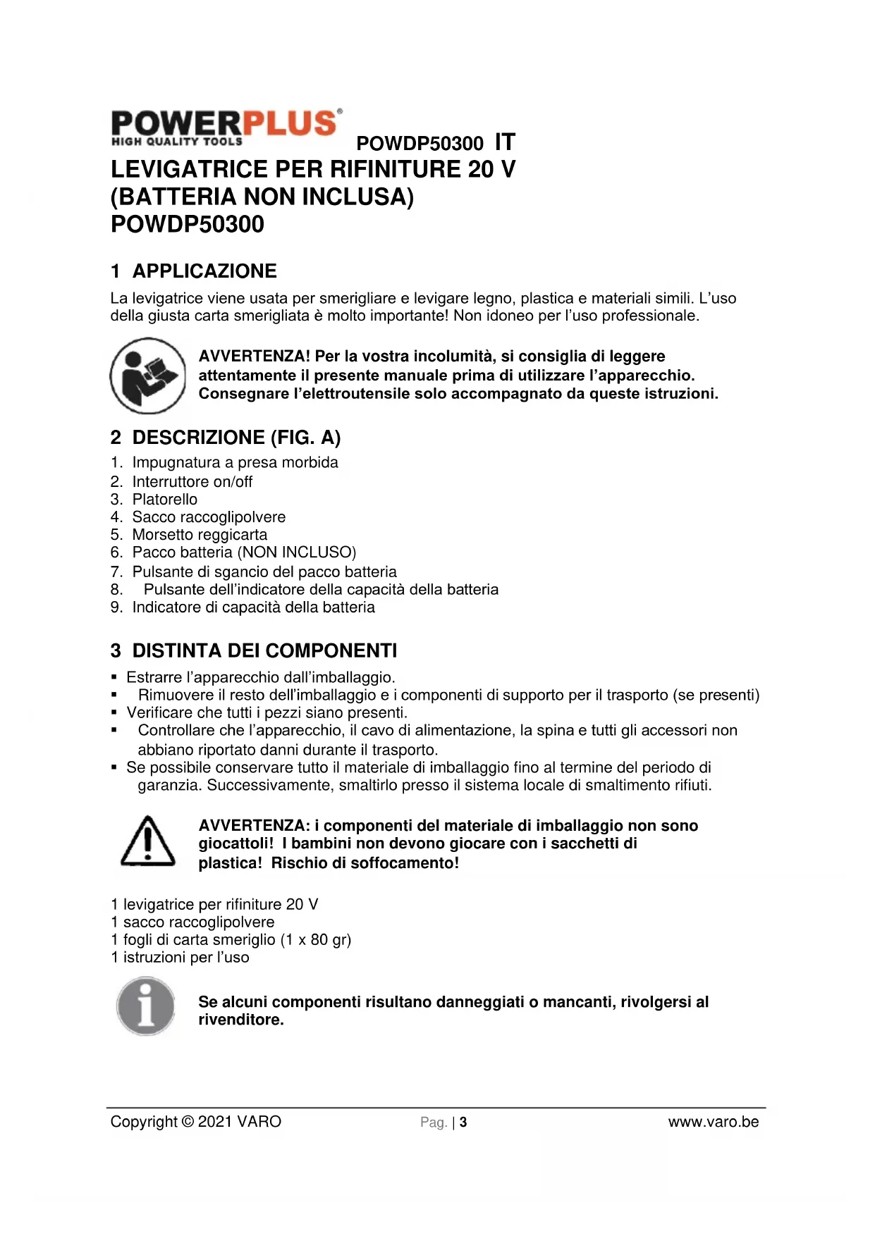 Con la presente, VARO – Vic. Van Rompuy N.V. – Joseph Van Instraat 9 – B2500 Lier, Belgio, dichiara che Descrizione dell’apparecchio: Levigatrice per rifiniture 20 V – Alimentata a batteria Marchio: PowerPlus Numero articolo: POWDP50300 è conforme ai requisiti essenziali e alle altre disposizioni pertinenti stabilite dalle Direttive Europee in base all’applicazione delle norme europee armonizzate. Qualsiasi modifica effettuata sul prodotto rende nulla questa dichiarazione. Direttive europee (inclusi eventuali emendamenti fino alla data della firma): 2011/65/EU 2006/42/EC 2014/30/EU Norme europee armonizzate (inclusi eventuali emendamenti fino alla data della firma): EN62841-1 : 2015 EN62841-2-4 : 2014 EN55014-1 : 2017 EN55014-2 : 2015 Depositario della documentazione tecnica: Philippe Vankerkhove, VARO – Vic. Van Rompuy N.V. Il sottoscritto agisce in nome e per conto del CEO della società, Ludo Mertens Certification Manager 28/12/2020, Lier - BelgiumPOWDP50300 PT Copyright © 2021 VARO Página | 1 www.varo.be 1 APLICAÇÃO ......................................................................................... 3