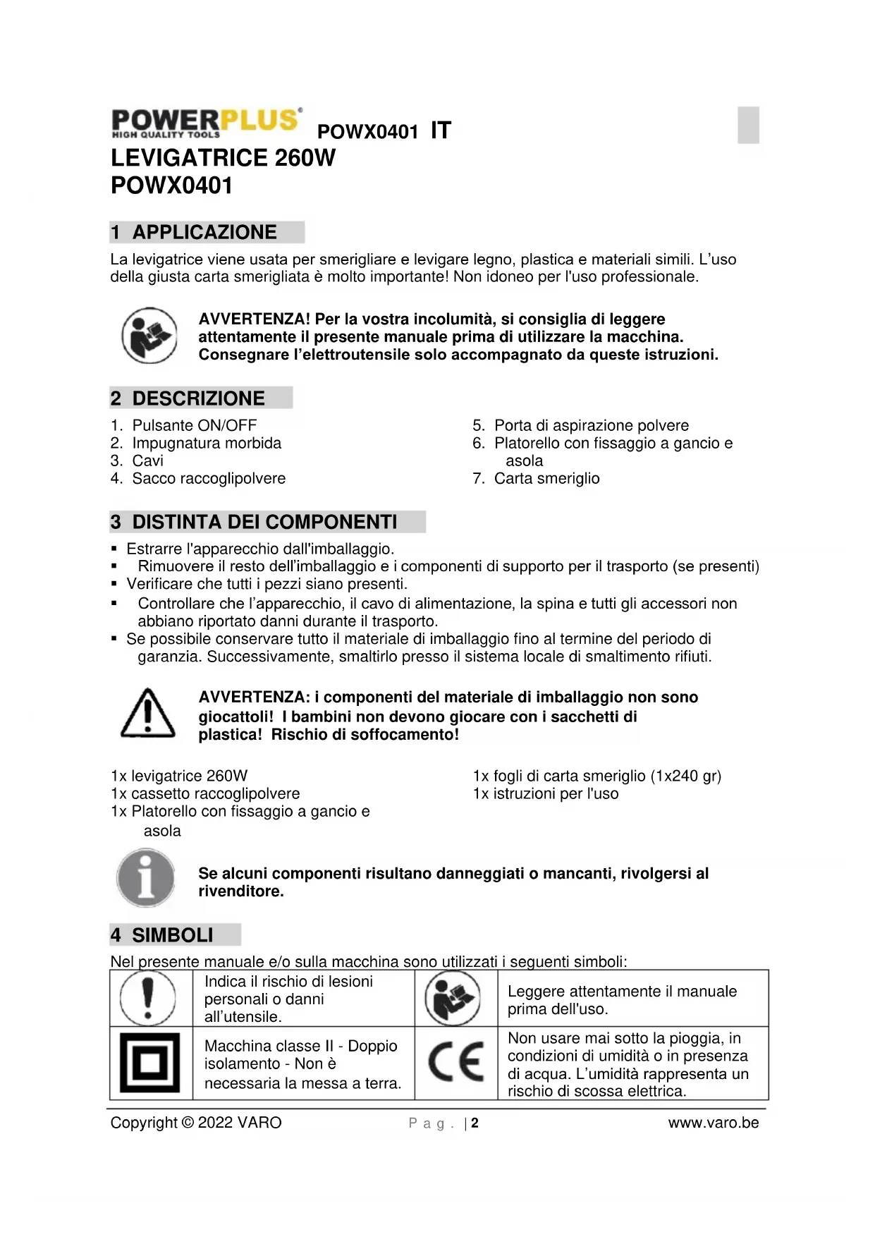 Copyright © 2022 VARO P a g . | 2 www.varo.be LEVIGATRICE 260W POWX0401 1 APPLICAZIONE La levigatrice viene usata per smerigliare e levigare legno, plastica e materiali simili. L’uso della giusta carta smerigliata è molto importante! Non idoneo per l'uso professionale. AVVERTENZA! Per la vostra incolumità, si consiglia di leggere attentamente il presente manuale prima di utilizzare la macchina. Consegnare l’elettroutensile solo accompagnato da queste istruzioni. 2 DESCRIZIONE