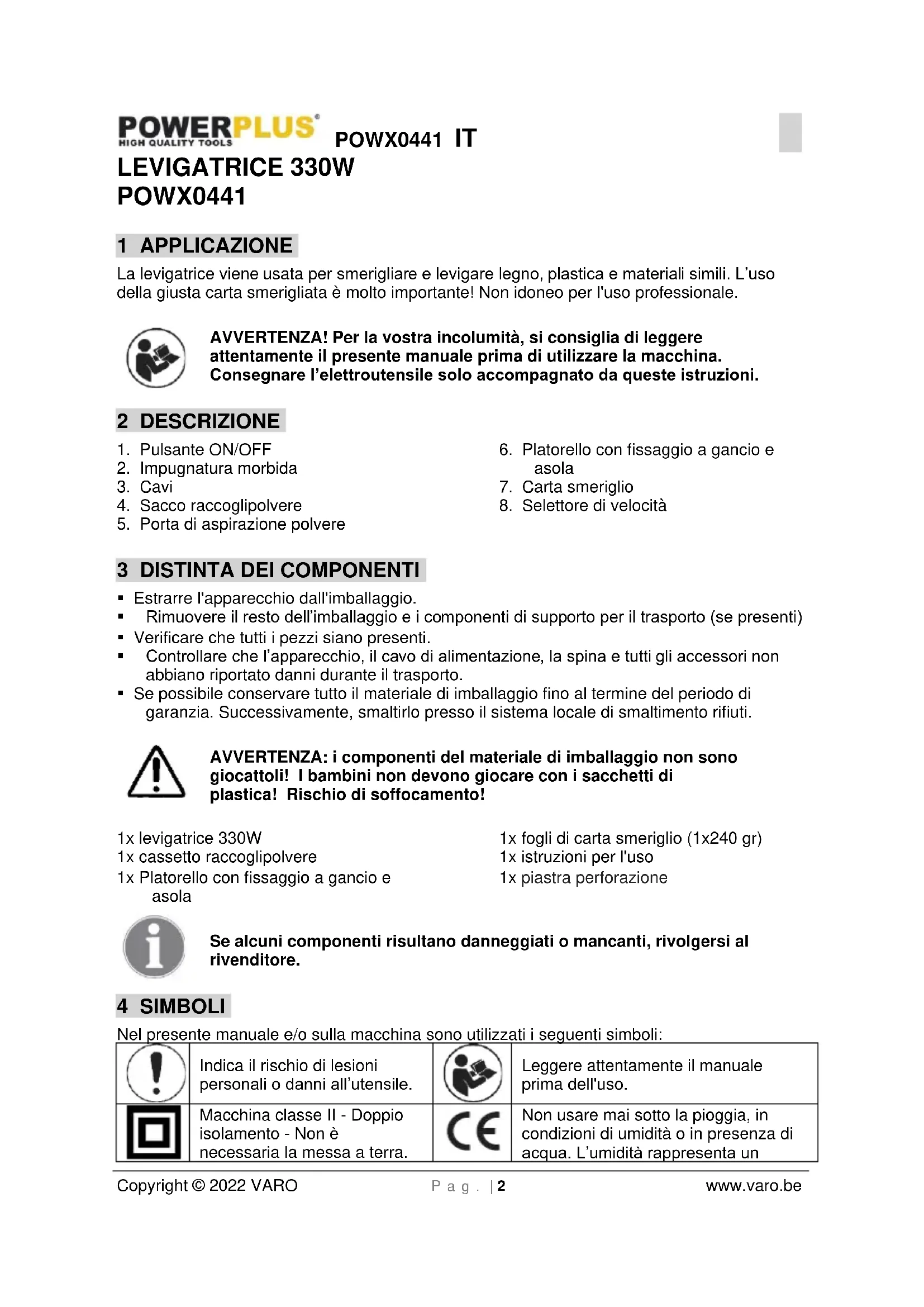 Copyright © 2022 VARO P a g . | 2 www.varo.be LEVIGATRICE 330W POWX0441 1 APPLICAZIONE La levigatrice viene usata per smerigliare e levigare legno, plastica e materiali simili. L’uso della giusta carta smerigliata è molto importante! Non idoneo per l'uso professionale. AVVERTENZA! Per la vostra incolumità, si consiglia di leggere attentamente il presente manuale prima di utilizzare la macchina. Consegnare l’elettroutensile solo accompagnato da queste istruzioni. 2 DESCRIZIONE