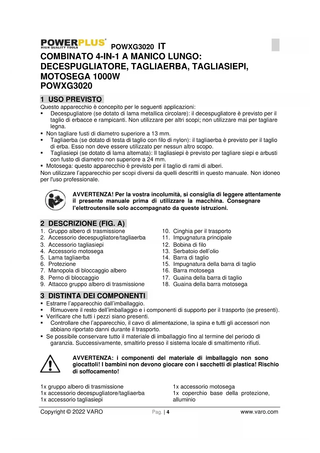 Copyright © 2022 VARO Pag. | 4 www.varo.com COMBINATO 4-IN-1 A MANICO LUNGO: DECESPUGLIATORE, TAGLIAERBA, TAGLIASIEPI, MOTOSEGA 1000W POWXG3020 1 USO PREVISTO Questo apparecchio è concepito per le seguenti applicazioni: