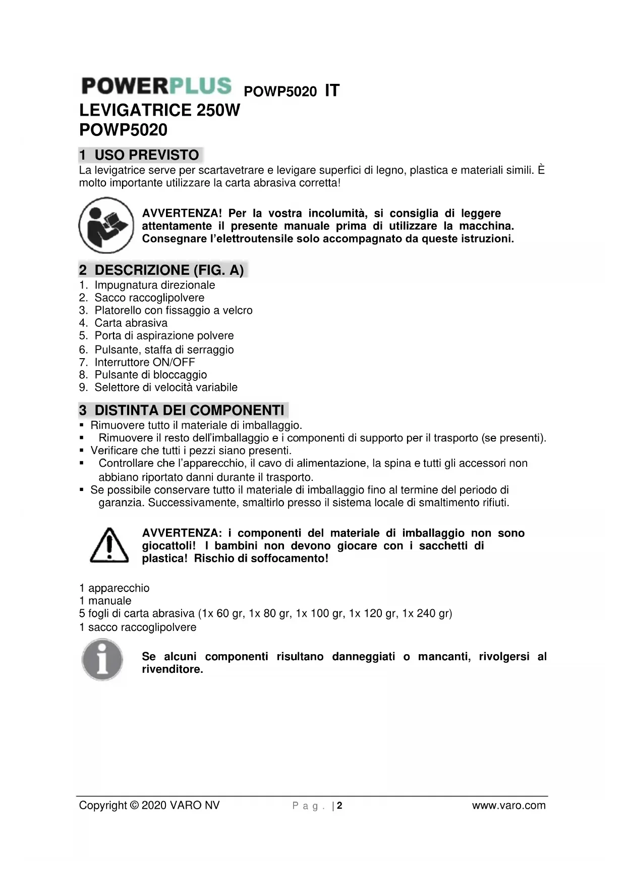 Copyright © 2020 VARO NV P a g . | 2 www.varo.com LEVIGATRICE 250W POWP5020 1 USO PREVISTO La levigatrice serve per scartavetrare e levigare superfici di legno, plastica e materiali simili. È molto importante utilizzare la carta abrasiva corretta! AVVERTENZA! Per la vostra incolumità, si consiglia di leggere attentamente il presente manuale prima di utilizzare la macchina. Consegnare l’elettroutensile solo accompagnato da queste istruzioni. 2 DESCRIZIONE (FIG. A)