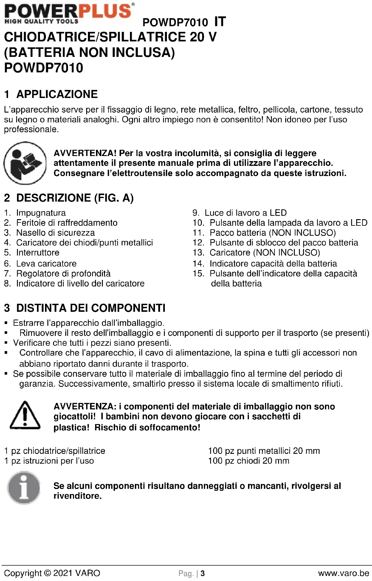 - Se possibile conservare tutto il materiale di imballaggio fino al termine del periodo di garanzia. Successivamente, smaltirlo presso il sistema locale di smaltimento rifiuti. AVVERTENZA: i componenti del materiale di imballaggio non sono giocattoli! I bambini non devono giocare con i sacchetti di plastica! Rischio di soffocamento! 1 pz chiodatrice/spillatrice 1 pz istruzioni per l’uso 100 pz punti metallici 20 mm 100 pz chiodi 20 mm Se alcuni componenti risultano danneggiati o mancanti, rivolgersi al rivenditore.POWDP7010 IT Copyright © 2021 VARO Pag. | 4 www.varo.be 4 SIMBOLI Nel presente manuale e/o sull’apparecchio sono utilizzati i seguenti simboli: