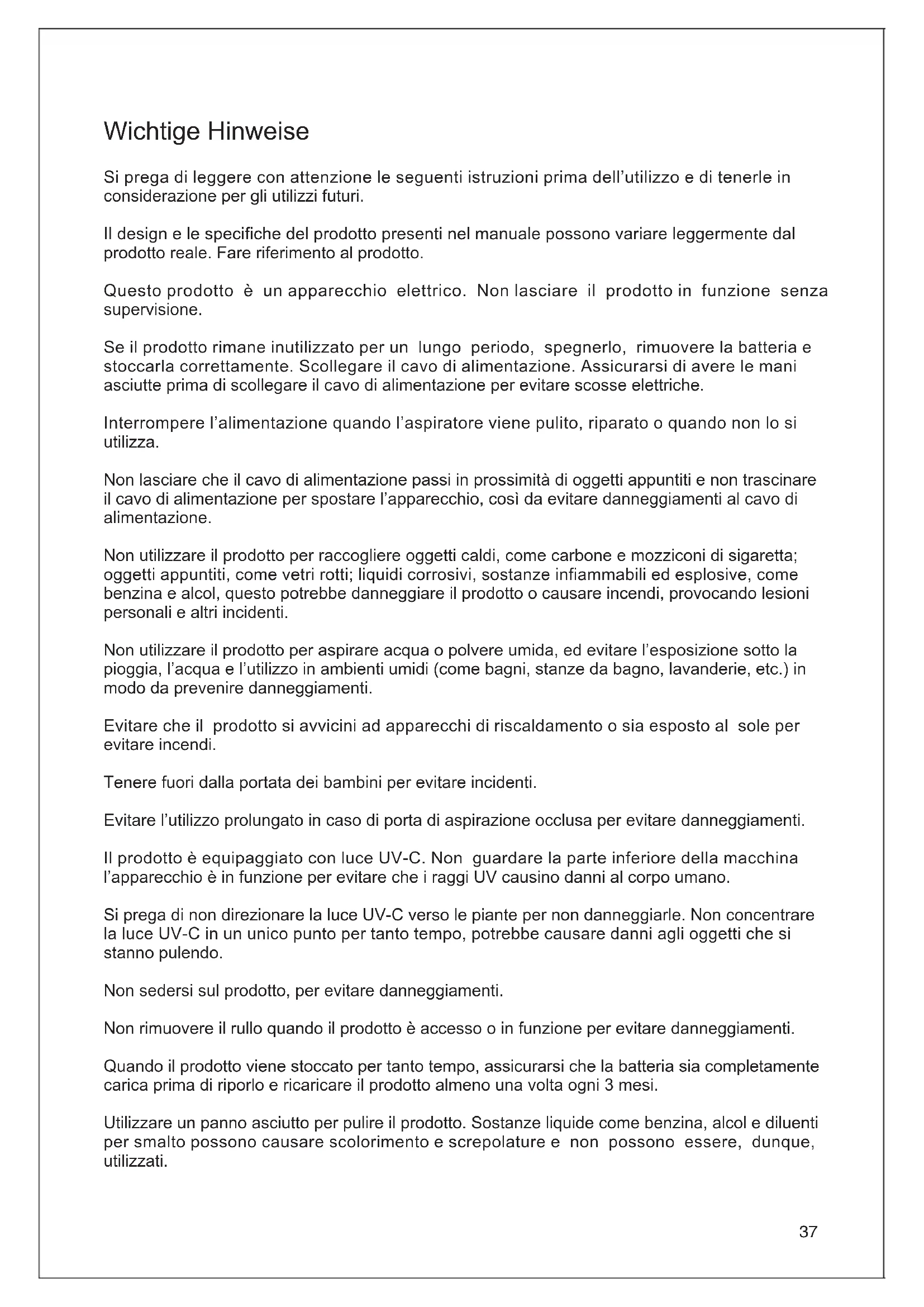 M236 Info des Herstellers Mise au rebut La machine, les accessoires et l'emballage doivent être triés pour un recyclage respectueux de l'environnement. Ne pas jeter la machine dans les ordures ménagères! Uniquement pour les pays de la CE : Conformément à la directive européenne 2012/19/UE, les machines qui ne sont plus utilisables, et conformément à la directive européenne 2006/66/CE, le bloc de piles/batteries défectueux ou usagé, doivent être collectés séparément et éliminés de manière écologique. Bloc de piles/batteries Les batteries intégrées ne peuvent être retirées pour être éliminées que par du personnel qualié. L'ouverture de la coque du boîtier peut endommager ou détruire la machine. Ne pas jeter les blocs de batteries/piles dans les ordures ménagères, le feu ou l'eau. Le bloc de piles/batteries doit, si possible, être déchargé, collecté, recyclé ou éliminé d'une manière respectueuse de l'environnement. Sous réserve de modications sans préavis. s Informations sur la garantie Ce produit est couvert par une garantie de une année à compter de la date d'achat. Elle ne couvre pas l'usure normale, l'utilisation commerciale, les modifications apportées à l'équipement après l'achat, les activités de nettoyage, la mauvaise utilisation, les dommages causés par l'acheteur ou par des tiers, les dommages imputables à l'environnement extérieur. Fabricant Kingclean Electric Co., Ltd Adresse No.1 Xiangyang road, Suzhou New District, Jiangsu province, 215009, China37 Wichtige Hinweise Si prega di leggere con attenzione le seguenti istruzioni prima dell’utilizzo e di tenerle in considerazione per gli utilizzi futuri. Il design e le specifiche del prodotto presenti nel manuale possono variare leggermente dal prodotto reale. Fare riferimento al prodotto. Questo prodotto è un apparecchio elettrico. Non lasciare il prodotto in funzione senza supervisione. Se il prodotto rimane inutilizzato per un lungo periodo, spegnerlo, rimuovere la batteria e stoccarla correttamente. Scollegare il cavo di alimentazione. Assicurarsi di avere le mani asciutte prima di scollegare il cavo di alimentazione per evitare scosse elettriche. Interrompere l’alimentazione quando l’aspiratore viene pulito, riparato o quando non lo si utilizza. Non lasciare che il cavo di alimentazione passi in prossimità di oggetti appuntiti e non trascinare il cavo di alimentazione per spostare l’apparecchio, così da evitare danneggiamenti al cavo di alimentazione. Non utilizzare il prodotto per raccogliere oggetti caldi, come carbone e mozziconi di sigaretta; oggetti appuntiti, come vetri rotti; liquidi corrosivi, sostanze infiammabili ed esplosive, come benzina e alcol, questo potrebbe danneggiare il prodotto o causare incendi, provocando lesioni personali e altri incidenti. Non utilizzare il prodotto per aspirare acqua o polvere umida, ed evitare l’esposizione sotto la pioggia, l’acqua e l’utilizzo in ambienti umidi (come bagni, stanze da bagno, lavanderie, etc.) in modo da prevenire danneggiamenti. Evitare che il prodotto si avvicini ad apparecchi di riscaldamento o sia esposto al sole per evitare incendi. Tenere fuori dalla portata dei bambini per evitare incidenti. Evitare l’utilizzo prolungato in caso di porta di aspirazione occlusa per evitare danneggiamenti. Il prodotto è equipaggiato con luce UV-C. Non guardare la parte inferiore della macchina l’apparecchio è in funzione per evitare che i raggi UV causino danni al corpo umano. Si prega di non direzionare la luce UV-C verso le piante per non danneggiarle. Non concentrare la luce UV-C in un unico punto per tanto tempo, potrebbe causare danni agli oggetti che si stanno pulendo. Non sedersi sul prodotto, per evitare danneggiamenti. Non rimuovere il rullo quando il prodotto è accesso o in funzione per evitare danneggiamenti. Quando il prodotto viene stoccato per tanto tempo, assicurarsi che la batteria sia completamente carica prima di riporlo e ricaricare il prodotto almeno una volta ogni 3 mesi. Utilizzare un panno asciutto per pulire il prodotto. Sostanze liquide come benzina, alcol e diluenti per smalto possono causare scolorimento e screpolature e non possono essere, dunque, utilizzati.38 Il prodotto contiene batterie. Assicurarsi di riciclarle correttamente ed in sicurezza. Non disperdere nell’ambiente. Se il cavo di alimentazione è danneggiato, al ne di prevenire pericoli, deve essere riparato o sostituito dal produttore, dal centro assistenza o da un professionista. Questo apparecchio può essere utilizzato da bambini di età pari o superiore a 8 anni e da persone con capacità siche, sensoriali o mentali ridotte o prive di esperienza e conoscenza, purchè siano supervisionate o istruite sull'utilizzo dell'apparecchio in modo sicuro e ne comprendono i pericoli coinvolti. L'apparecchio deve essere utilizzato esclusivamente con l'alimentatore in dotazione. Assemblaggio del prodotto Nome delle parti Pulsante MODE Pulsante On/Off Schermo LED Presa di ricarica39 Fermo del coperchio della spazzola Coperchio della spazzola Spazzola Luce UV Generatore di ultrasuoni Accessorio per la pulizia della spazzola Adattatore Filtro HEPA Batteria Lista imballaggio Aspiratore anti-acaro Adattatore Batteria Accessorio per pulizia spazzo-