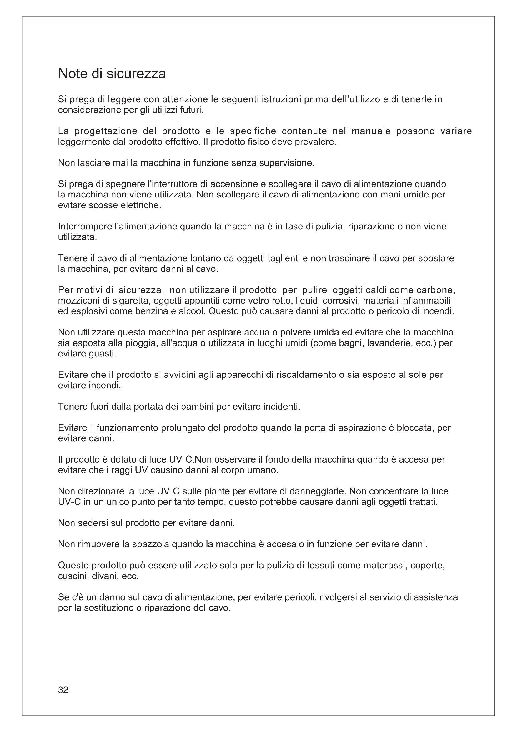 220-240V~ 50-60Hz31 Informations sur la garantie Ce produit est couvert par une garantie de une année à compter de la date d'achat. Elle ne couvre pas l'usure normale, l'utilisation commerciale, les modifications apportées à l'équipement après l'achat, les activités de nettoyage, la mauvaise utilisation, les dommages causés par l'acheteur ou par des tiers, les dommages imputables à l'environnement extérieur.32 Note di sicurezza Si prega di leggere con attenzione le seguenti istruzioni prima dell’utilizzo e di tenerle in considerazione per gli utilizzi futuri. La progettazione del prodotto e le specifiche contenute nel manuale possono variare leggermente dal prodotto effettivo. Il prodotto sico deve prevalere. Non lasciare mai la macchina in funzione senza supervisione. Si prega di spegnere l'interruttore di accensione e scollegare il cavo di alimentazione quando la macchina non viene utilizzata. Non scollegare il cavo di alimentazione con mani umide per evitare scosse elettriche. Interrompere l'alimentazione quando la macchina è in fase di pulizia, riparazione o non viene utilizzata. Tenere il cavo di alimentazione lontano da oggetti taglienti e non trascinare il cavo per spostare la macchina, per evitare danni al cavo. Per motivi di sicurezza, non utilizzare il prodotto per pulire oggetti caldi come carbone, mozziconi di sigaretta, oggetti appuntiti come vetro rotto, liquidi corrosivi, materiali inammabili ed esplosivi come benzina e alcool. Questo può causare danni al prodotto o pericolo di incendi. Non utilizzare questa macchina per aspirare acqua o polvere umida ed evitare che la macchina sia esposta alla pioggia, all'acqua o utilizzata in luoghi umidi (come bagni, lavanderie, ecc.) per evitare guasti. Evitare che il prodotto si avvicini agli apparecchi di riscaldamento o sia esposto al sole per evitare incendi. Tenere fuori dalla portata dei bambini per evitare incidenti. Evitare il funzionamento prolungato del prodotto quando la porta di aspirazione è bloccata, per evitare danni. Il prodotto è dotato di luce UV-C.Non osservare il fondo della macchina quando è accesa per evitare che i raggi UV causino danni al corpo umano. Non direzionare la luce UV-C sulle piante per evitare di danneggiarle. Non concentrare la luce UV-C in un unico punto per tanto tempo, questo potrebbe causare danni agli oggetti trattati. Non sedersi sul prodotto per evitare danni. Non rimuovere la spazzola quando la macchina è accesa o in funzione per evitare danni. Questo prodotto può essere utilizzato solo per la pulizia di tessuti come materassi, coperte, cuscini, divani, ecc. Se c'è un danno sul cavo di alimentazione, per evitare pericoli, rivolgersi al servizio di assistenza per la sostituzione o riparazione del cavo.33 Assemblaggio del prodotto Nome delle parti Pulsante MODE Pulsante On/Off Schermo LED Fermo del coperchio della spazzola Coperchio della spazzola Spazzola Luce UV Generatore di ultrasuoni Mini spazzola Filtro HEPA Cavo di alimentazione34 Lista imballaggio Aspiratore anti-acaro Mini spazzola Filtro HEPA Manuale d’uso