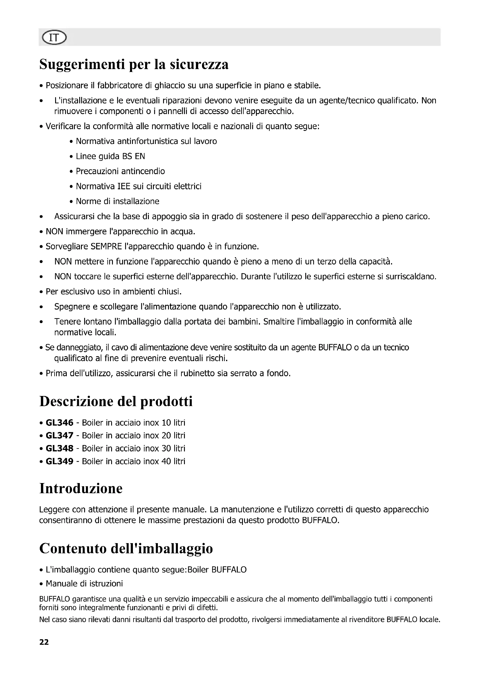 - GL349 - Boiler in acciaio inox 40 litri Introduzione Leggere con attenzione il presente manuale. La manutenzione e l'utilizzo corretti di questo apparecchio consentiranno di ottenere le massime prestazioni da questo prodotto BUFFALO. Contenuto dell'imballaggio