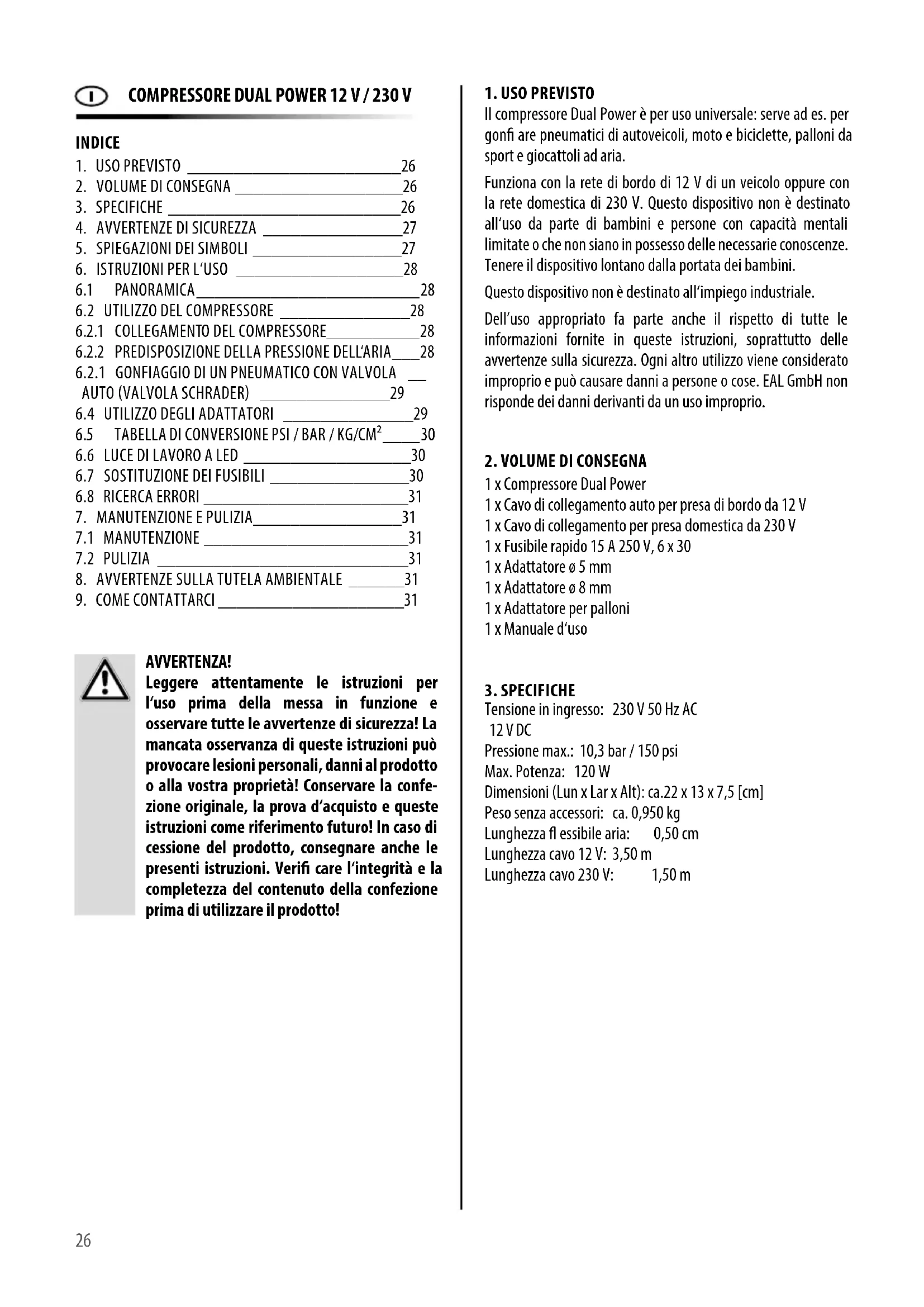 Il compressore Dual Power è per uso universale: serve ad es. per gon are pneumatici di autoveicoli, moto e biciclette, palloni da sport e giocattoli ad aria. Funziona con la rete di bordo di 12 V di un veicolo oppure con la rete domestica di 230 V. Questo dispositivo non è destinato all‘uso da parte di bambini e persone con capacità mentali limitate o che non siano in possesso delle necessarie conoscenze. Tenere il dispositivo lontano dalla portata dei bambini. Questo dispositivo non è destinato all‘impiego industriale. Dell’uso appropriato fa parte anche il rispetto di tutte le informazioni fornite in queste istruzioni, soprattutto delle avvertenze sulla sicurezza. Ogni altro utilizzo viene considerato improprio e può causare danni a persone o cose. EAL GmbH non risponde dei danni derivanti da un uso improprio. AVVERTENZA!