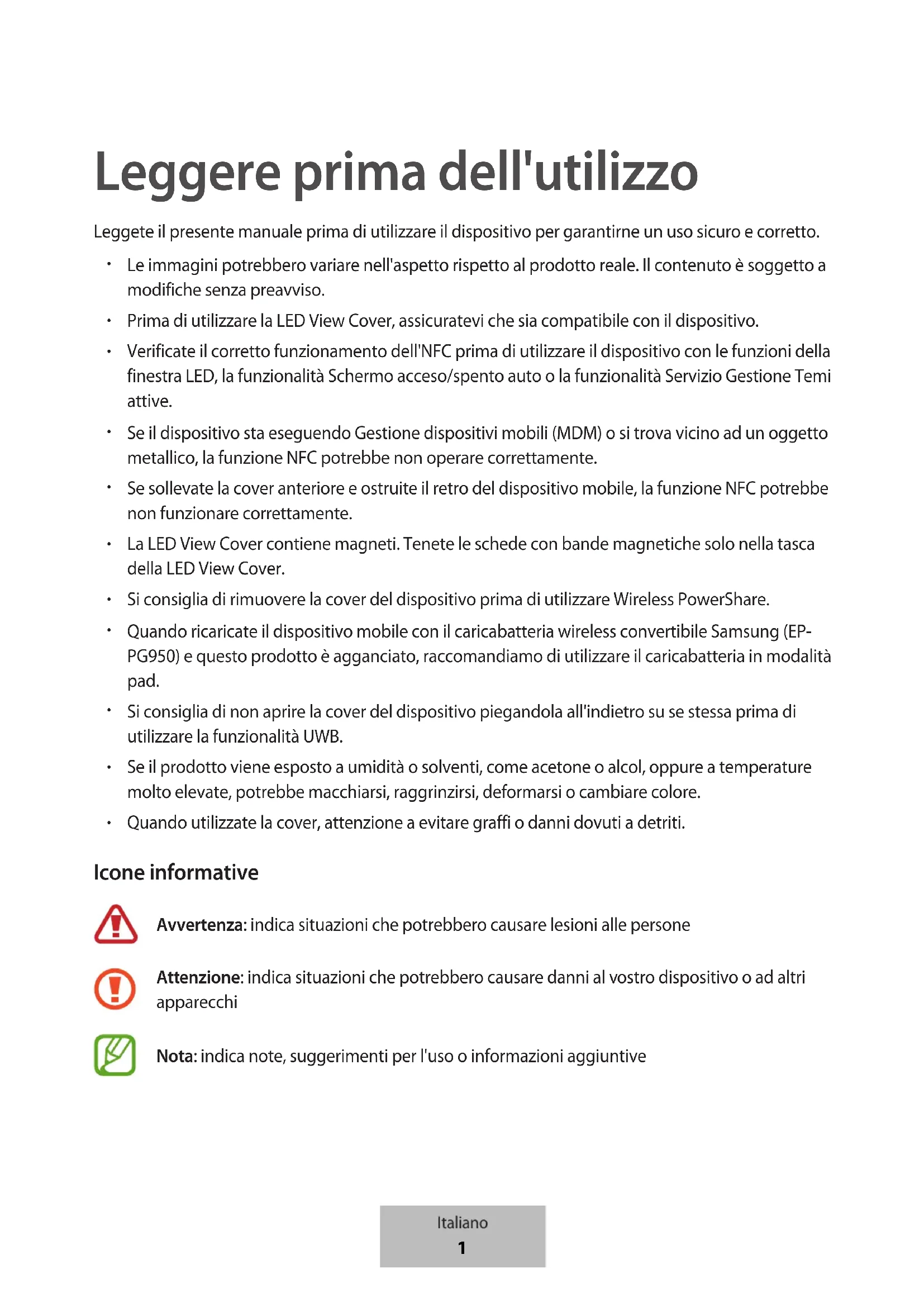 Quando utilizzate la cover, attenzione a evitare graffi o danni dovuti a detriti. Icone informative Avvertenza: indica situazioni che potrebbero causare lesioni alle persone Attenzione: indica situazioni che potrebbero causare danni al vostro dispositivo o ad altri apparecchi Nota: indica note, suggerimenti per l'uso o informazioni aggiuntive Italiano