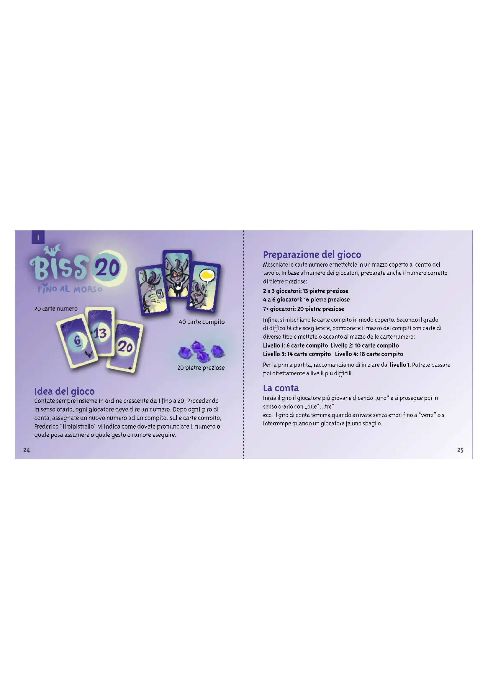 Biss20_Karten_VS_final_3.indd 60Biss20_Karten_VS_final_3.indd 60 05.08.20 15:1805.08.20 15:18 Biss20_Karten_VS_final_3.indd 43Biss20_Karten_VS_final_3.indd 43 05.08.20 15:1705.08.20 15:17 Biss20_Karten_RS_final_4.indd 20Biss20_Karten_RS_final_4.indd 20 04.08.20 14:2604.08.20 14:26 Biss20_Karten_RS_final_4.indd 13Biss20_Karten_RS_final_4.indd 13 04.08.20 14:2604.08.20 14:26 Biss20_Karten_RS_final_4.indd 6Biss20_Karten_RS_final_4.indd 6 04.08.20 14:2604.08.20 14:26 Biss20_Karten_VS_final_3.indd 25Biss20_Karten_VS_final_3.indd 25 05.08.20 15:1605.08.20 15:16 Idea del gioco Contate sempre insieme in ordine crescente da 1 fino a 20. Procedendo in senso orario, ogni giocatore deve dire un numero. Dopo ogni giro di conta, assegnate un nuovo numero ad un compito. Sulle carte compito, Frederico “il pipistrello” vi indica come dovete pronunciare il numero o quale posa assumere o quale gesto o rumore eseguire. 20 pietre preziose 40 carte compito 20 carte numero Preparazione del gioco Mescolate le carte numero e mettetele in un mazzo coperto al centro del tavolo. In base al numero dei giocatori, preparate anche il numero corretto di pietre preziose: 2 a 3 giocatori: 13 pietre preziose 4 a 6 giocatori: 16 pietre preziose 7+ giocatori: 20 pietre preziose Infine, si mischiano le carte compito in modo coperto. Secondo il grado di difficoltà che sceglierete, componete il mazzo dei compiti con carte di diverso tipo e mettetelo accanto al mazzo delle carte numero: Livello 1: 6 carte compito Livello 2: 10 carte compito Livello 3: 14 carte compito Livello 4: 18 carte compito Per la prima partita, raccomandiamo di iniziare dal livello 1. Potrete passare poi direttamente a livelli più difficili. La conta Inizia il giro il giocatore più giovane dicendo „uno“ e si prosegue poi in senso orario con „due“, „tre“ ecc. Il giro di conta termina quando arrivate senza errori fino a “venti” o si interrompe quando un giocatore fa uno sbaglio.26