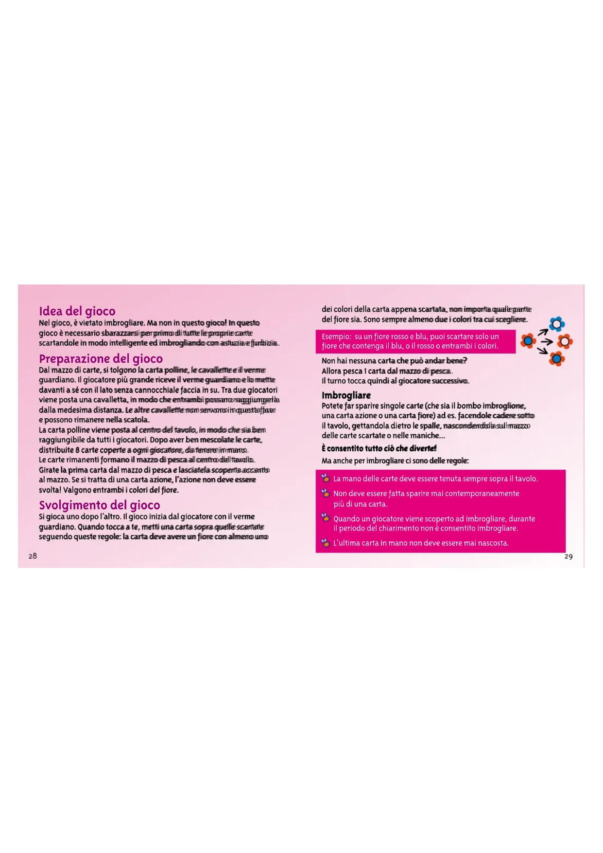 Nel gioco, è vietato imbrogliare. Ma non in questo gioco! In questo gioco è necessario sbarazzarsi per primo di tutte le proprie carte scartandole in modo intelligente ed imbrogliando con astuzia e furbizia. Dal mazzo di carte, si tolgono la carta polline, le cavallette e il verme guardiano. Il giocatore più grande riceve il verme guardiano e lo mette davanti a sé con il lato senza cannocchiale faccia in su. Tra due giocatori viene posta una cavalletta, in modo che entrambi possano raggiungerla dalla medesima distanza. Le altre cavallette non servono in questa fase e possono rimanere nella scatola. La carta polline viene posta al centro del tavolo, in modo che sia ben raggiungibile da tutti i giocatori. Dopo aver ben mescolate le carte, distribuite 8 carte coperte a ogni giocatore, da tenere in mano. Le carte rimanenti formano il mazzo di pesca al centro del tavolo. Girate la prima carta dal mazzo di pesca e lasciatela scoperta accanto al mazzo. Se si tratta di una carta azione, l’azione non deve essere svolta! Valgono entrambi i colori del fiore. Si gioca uno dopo l’altro. Il gioco inizia dal giocatore con il verme guardiano. Quando tocca a te, metti una carta sopra quelle scartate seguendo queste regole: la carta deve avere un fiore con almeno uno dei colori della carta appena scartata, non importa quale parte del fiore sia. Sono sempre almeno due i colori tra cui scegliere. Esempio: su un fiore rosso e blu, puoi scartare solo un fiore che contenga il blu, o il rosso o entrambi i colori. Non hai nessuna carta che può andar bene? Allora pesca 1 carta dal mazzo di pesca. Il turno tocca quindi al giocatore successivo. Imbrogliare Potete far sparire singole carte (che sia il bombo imbroglione, una carta azione o una carta fiore) ad es. facendole cadere sotto il tavolo, gettandola dietro le spalle, nascondendola sul mazzo delle carte scartate o nelle maniche... È consentito tutto ciò che diverte! Ma anche per imbrogliare ci sono delle regole: La mano delle carte deve essere tenuta sempre sopra il tavolo. Non deve essere fatta sparire mai contemporaneamente più di una carta. Quando un giocatore viene scoperto ad imbrogliare, durante il periodo del chiarimento non è consentito imbrogliare. L’ultima carta in mano non deve essere mai nascosta. Idea del gioco Nel gioco, è vietato imbrogliare. Ma non in questo gioco! In questo gioco è necessario sbarazzarsi per primo di tutte le proprie carte scartandole in modo intelligente ed imbrogliando con astuzia e furbizia. Preparazione del gioco Dal mazzo di carte, si tolgono la carta polline, le cavallette e il verme guardiano. Il giocatore più grande riceve il verme guardiano e lo mette davanti a sé con il lato senza cannocchiale faccia in su. Tra due giocatori viene posta una cavalletta, in modo che entrambi possano raggiungerla dalla medesima distanza. Le altre cavallette non servono in questa fase e possono rimanere nella scatola. La carta polline viene posta al centro del tavolo, in modo che sia ben raggiungibile da tutti i giocatori. Dopo aver ben mescolate le carte, distribuite 8 carte coperte a ogni giocatore, da tenere in mano. Le carte rimanenti formano il mazzo di pesca al centro del tavolo. Girate la prima carta dal mazzo di pesca e lasciatela scoperta accanto al mazzo. Se si tratta di una carta azione, l’azione non deve essere svolta! Valgono entrambi i colori del fiore. Svolgimento del gioco Si gioca uno dopo l’altro. Il gioco inizia dal giocatore con il verme guardiano. Quando tocca a te, metti una carta sopra quelle scartate seguendo queste regole: la carta deve avere un fiore con almeno uno dei colori della carta appena scartata, non importa quale parte del fiore sia. Sono sempre almeno due i colori tra cui scegliere. Esempio: su un fiore rosso e blu, puoi scartare solo un fiore che contenga il blu, o il rosso o entrambi i colori. Non hai nessuna carta che può andar bene? Allora pesca 1 carta dal mazzo di pesca. Il turno tocca quindi al giocatore successivo. Imbrogliare Potete far sparire singole carte (che sia il bombo imbroglione, una carta azione o una carta fiore) ad es. facendole cadere sotto il tavolo, gettandola dietro le spalle, nascondendola sul mazzo delle carte scartate o nelle maniche... È consentito tutto ciò che diverte! Ma anche per imbrogliare ci sono delle regole: La mano delle carte deve essere tenuta sempre sopra il tavolo. Non deve essere fatta sparire mai contemporaneamente più di una carta. Quando un giocatore viene scoperto ad imbrogliare, durante il periodo del chiarimento non è consentito imbrogliare. L’ultima carta in mano non deve essere mai nascosta.30