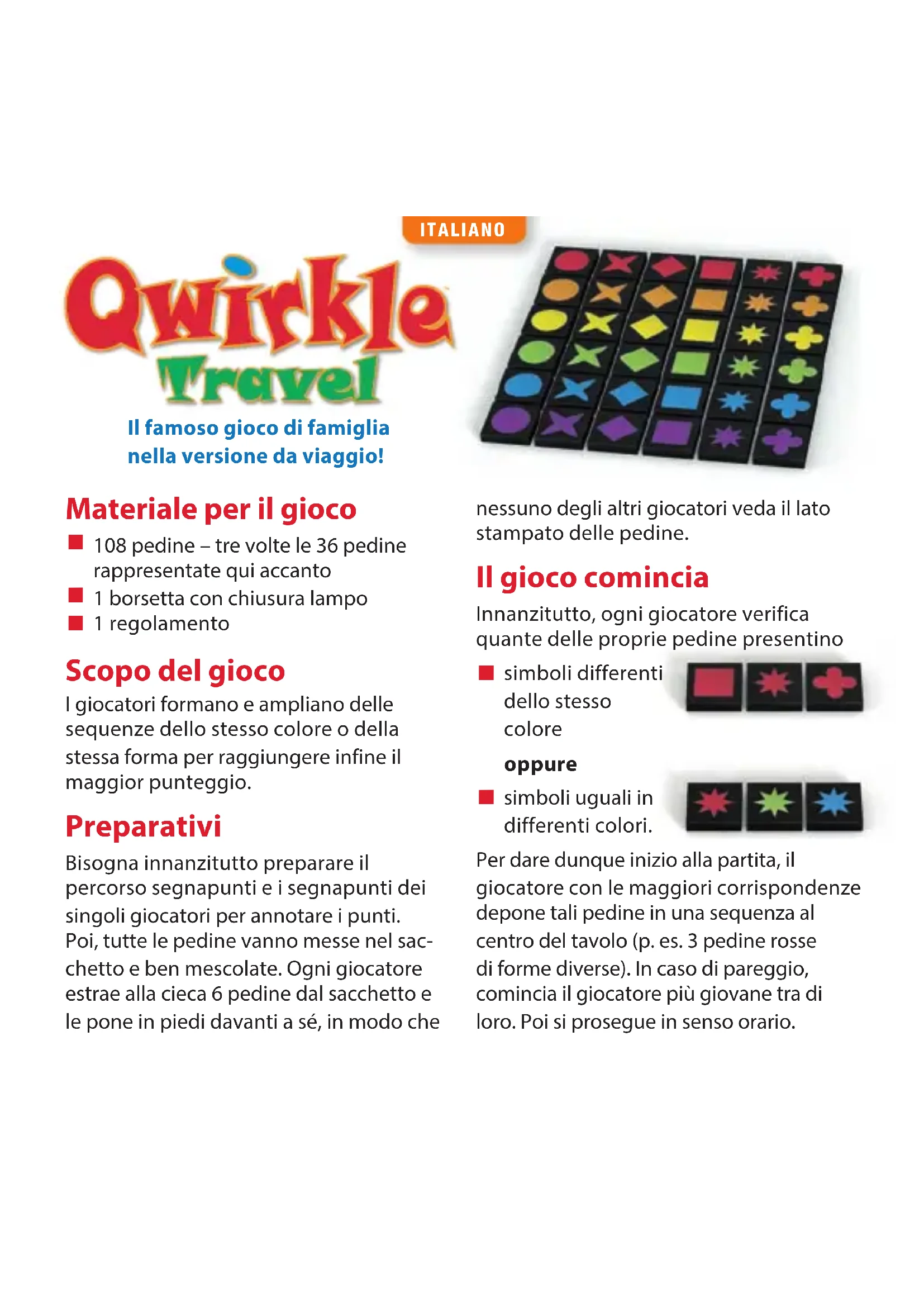 Invece di deporre le pedine, il giocatore può anche scambiare 1 fino a 6 delle sue pedine. In tal caso egli mette di lato le pedine che vuole scambiare ed estrae poi alla cieca il rispettivo numero di “pedine di scambio“ dal sacchetto. Infine getta le pedine messe di lato nel sacchetto. La sua mossa è dunque conclusa per il turno presente e nel suo prossimo turno potrà continuare a giocare con le pedine nuove. Se in un turno un giocatore non può aggiungere nessuna pedina, egli deve scambiare delle pedine. Punteggio Dopo ogni mossa conclusa di un giocatore si calcola e si annota il suo punteggio. Chi riesce a formare una sequenza o ad aggiungere una pedina, Esempio: QwirkleTravel_Anl_Final.indd 15 12.09.12 15:23Steffi aggiunge le pedine col bordo blu e ottiene 7 punti (4 per la sequenza delle stelle e 3 per la sequenza rossa che finora è composta soltanto di 3 pedine). Jörg aggiunge dunque le pedine col bordo rosso e vince 6 punti (4 per la sequenza gialla e 2 per le due pedine col rombo). Poi segue Antje. Lei aggiunge le pedine col bordo giallo e incassa 17 punti (3 per la sequenza dei rombi, 2 per la sequenza delle stelle a quattro punte e 12 per il Qwirkle creato nella sequenza rossa). ottiene 1 punto per ogni pedina in tale sequenza, incluse dunque anche le pedine che si trovavano già prima nella sequenza. Una pedina può rendere 2 punti se fa parte di due sequenze. Chi riesce a deporre una sequenza di 6 pedine crea un Qwirkle e ottiene per esso ulteriori 6 punti straordinari. Un Qwirkle rende dunque sempre 12 punti – 6 punti per le singole 6 pedine e 6 punti straordinari per aver creato un Qwirkle. Le 6 pedine devono essere o 6 pedine dello stesso colore e con forme differenti oppure 6 pedine della stessa forma e con colori differenti. Fine del gioco Non appena il sacchetto si svuoti, i giocatori non possono più estrarre nuove pedine dopo aver deposto quelle pro- prie. I giocatori continuano comunque a deporre le proprie pedine finché il primo giocatore depone la sua ultima pedina, terminando così immediatamente la partita. Tale giocatore ottiene inoltre un bonus di 6 punti per aver terminato la partita. Il giocatore col maggior punteggio vince la partita. Esempio: QwirkleTravel_Anl_Final.indd 16 12.09.12 15:23
