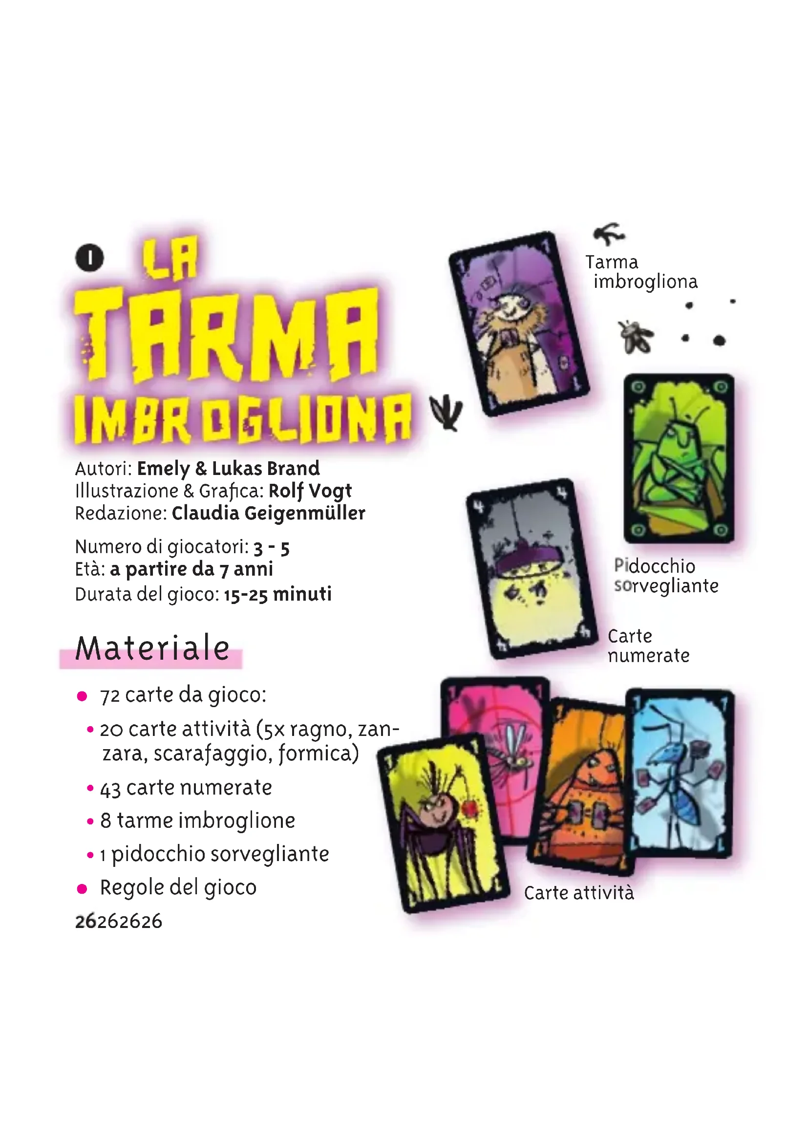Autori: Emely & Lukas Brand Illustrazione & Grafica: Rolf Vogt Redazione: Claudia Geigenmüller Numero di giocatori: 3 - 5 Età: a partire da 7 anni Durata del gioco: 15-25 minuti Materiale